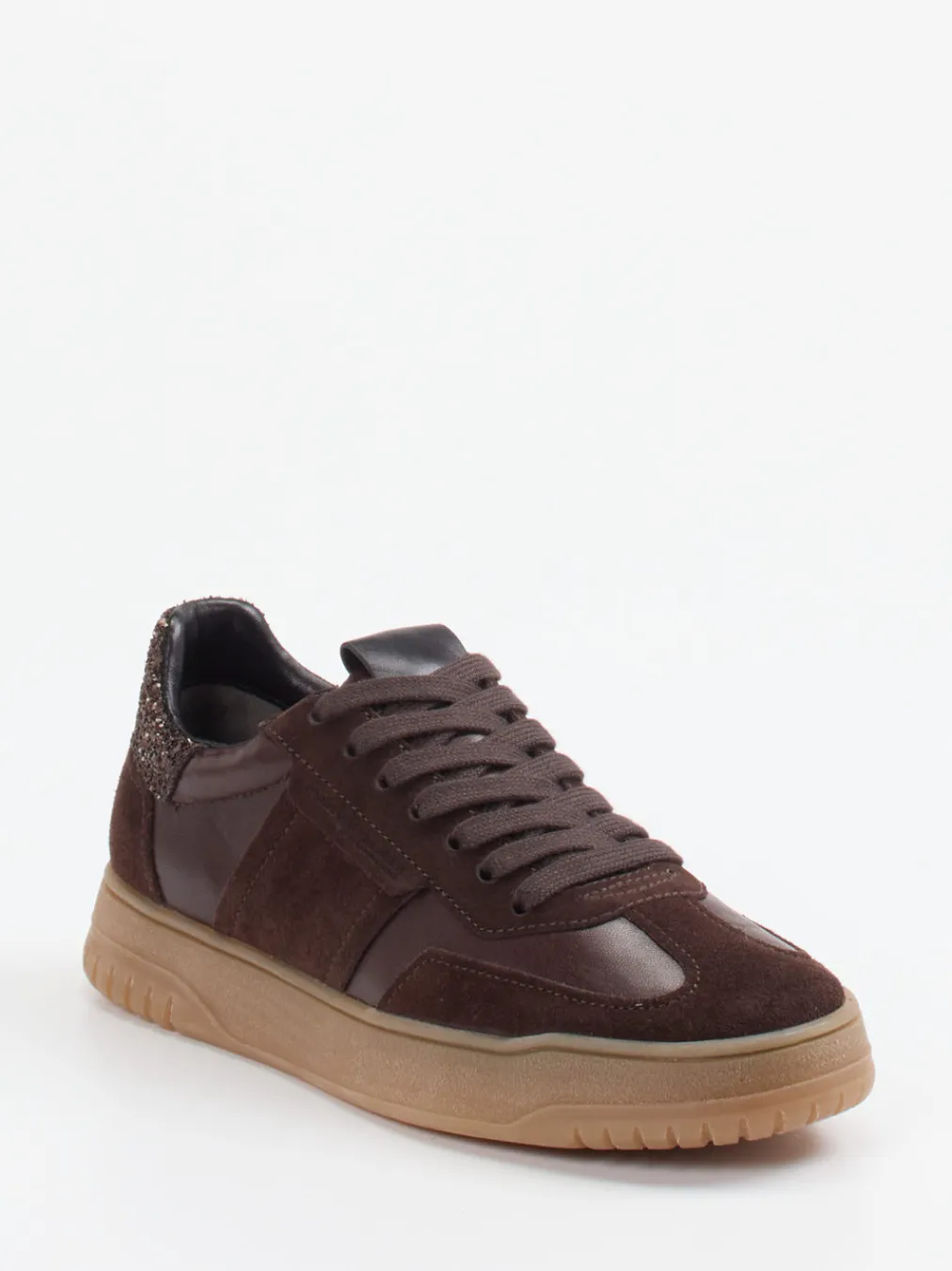 In Alltagssituationen, die Komfort und Stil erfordern, überzeugt dieses Modell durch einen edlen Materialmix aus Velours- und Glattleder, ergänzt durch eine samtig matte Textur mit leichtem Glanz. Der dunkelbraune Grundton mit karamellbraunen Akzenten sorgt für Wärme und Vielseitigkeit. Die klassische Low-Top-Silhouette mit Schnürung wird durch eine mit Glitzer besetzte Fersenkappe akzentuiert. Die honigfarbene 3 cm hohe Gummisohle verspricht angenehme Laufhöhe und sicheren Halt und unterstreicht den urbanen Charakter. Ein Favorit für trendbewusste Casual-Looks.