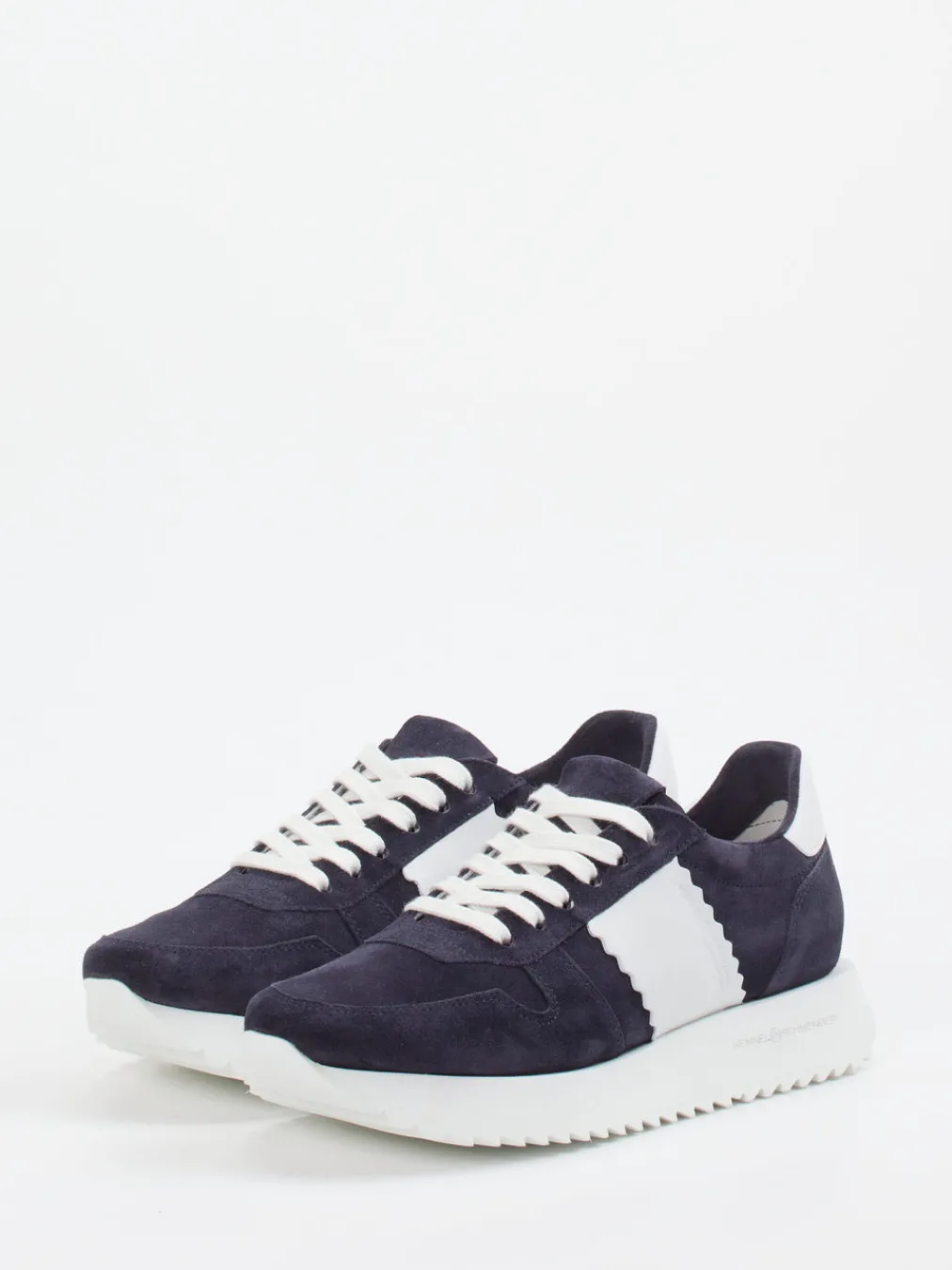 Für stilbewusste Tage in Stadt und Freizeit vereint der dunkelblaue Veloursleder-Sneaker samtig-matte Textur mit weißen Glattleder-Akzenten und markanter Zickzack-Kante. Die klassische Silhouette mit Schnürung wird durch die weiße Plateau-Gummisohle im Haifischzahnprofil modern interpretiert. Ein gepolstertes Wechselfußbett und Innenfutter aus weichem Ziegenleder sorgen für Komfort. Ein ideales Modell für entspannte Looks mit klarer Retro-Note und Alltagsnutzen.