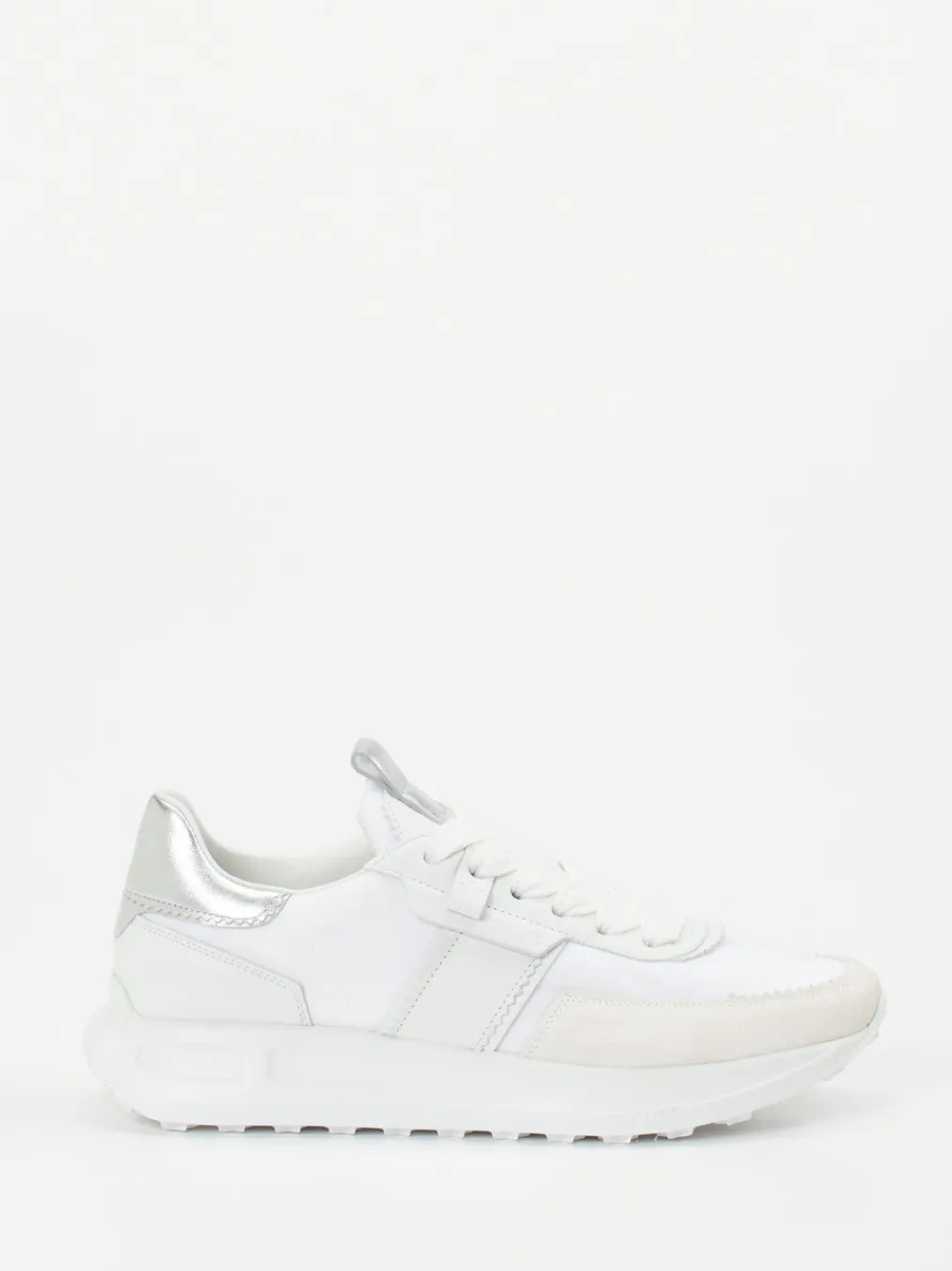 Ein sportlich-eleganter Sneaker mit innovativem Materialmix aus Veloursleder und Textil. Metallic-Akzente in Silber setzen einen subtilen Trendakzent für die kommende Saison.
