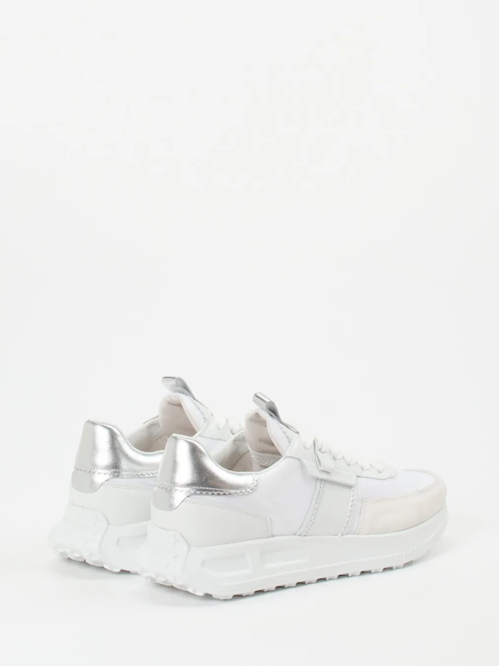Sportlicher Komfort trifft Metallic-Trend.Kennel & Schmenger präsentiert einen Damen-Sneaker mit stilvoller Komposition für urbane Casual-Looks. Ob beim Citywalk oder auf dem Weg ins Lieblingscafé – dieser Low-Top Sneaker vereint modische Klarheit mit funktionalem Anspruch. Das weiß gehaltene Obermaterial besteht aus weichem Veloursleder, ergänzt durch textile Partien und silberfarbene Glattlederelemente an Ferse und Zunge. Die sportlich-kompakte Form wirkt modern und unkompliziert, während die profilierte Leichtzellsohle für angenehmen Halt sorgt. Typische Streetstyle-Elemente spiegeln sich in der klaren Silhouette und dem sachlichen Uni-Design wider. Ideal zum Oversize-Hoodie oder zur verkürzten Jeans gestylt. Kennel & Schmenger verbindet trendbewusstes Design mit gewohnt hochwertiger Verarbeitung.
