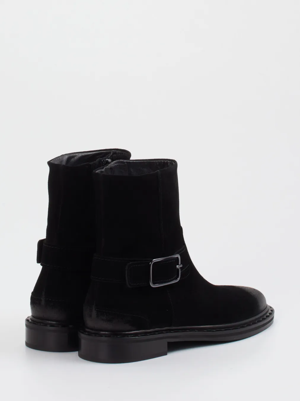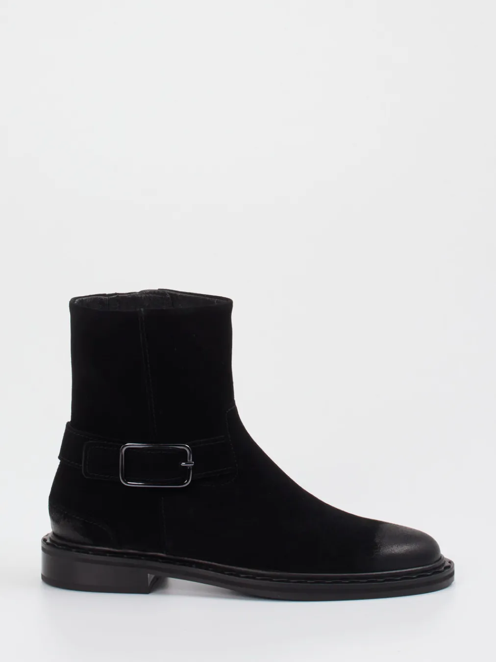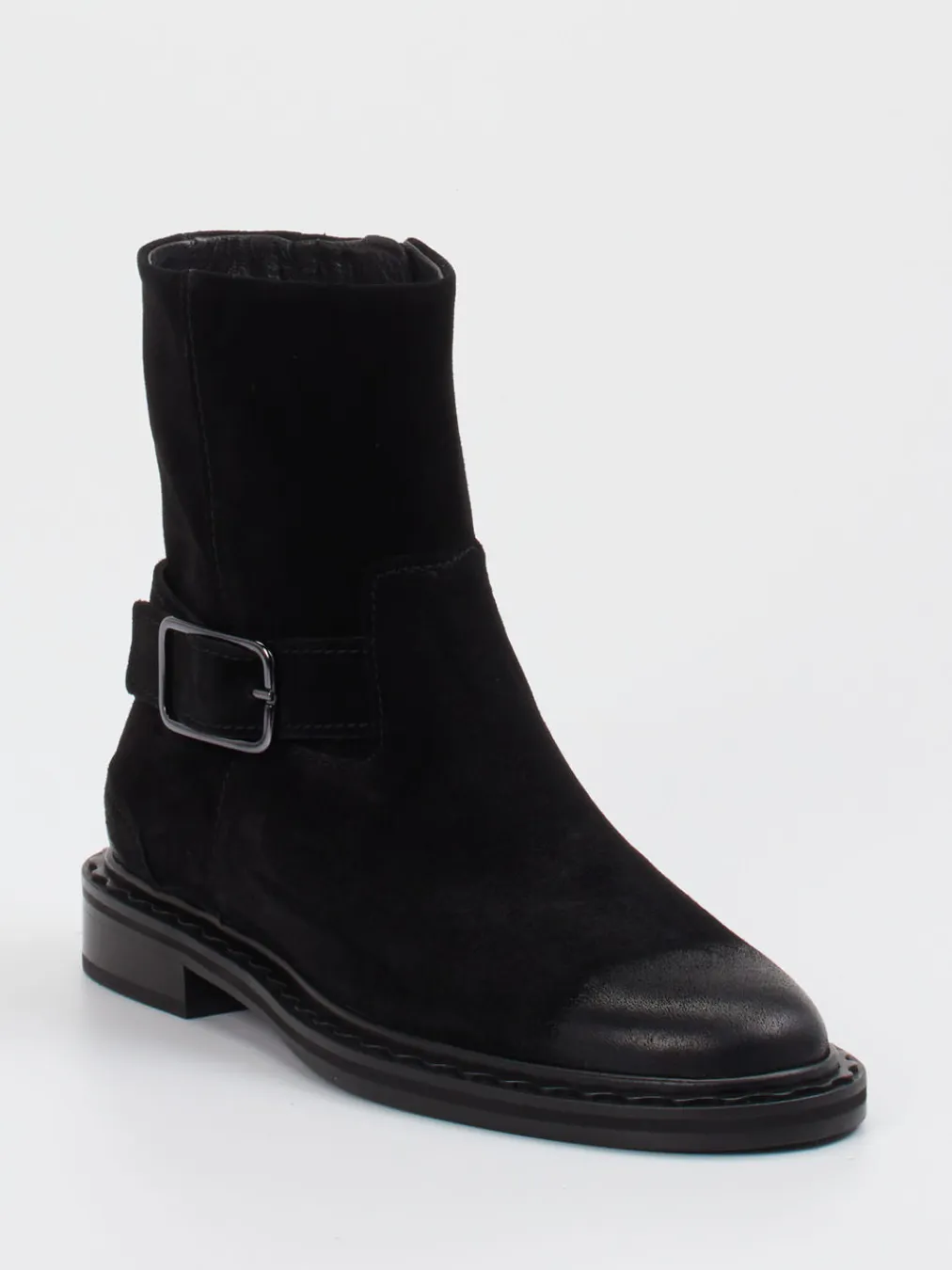 Die Stiefelette überzeugt mit einem edlen Materialmix aus samtig angeschliffenem Veloursleder und glatter Lederkappe. Urbaner Minimalismus trifft auf hochwertige Verarbeitung.