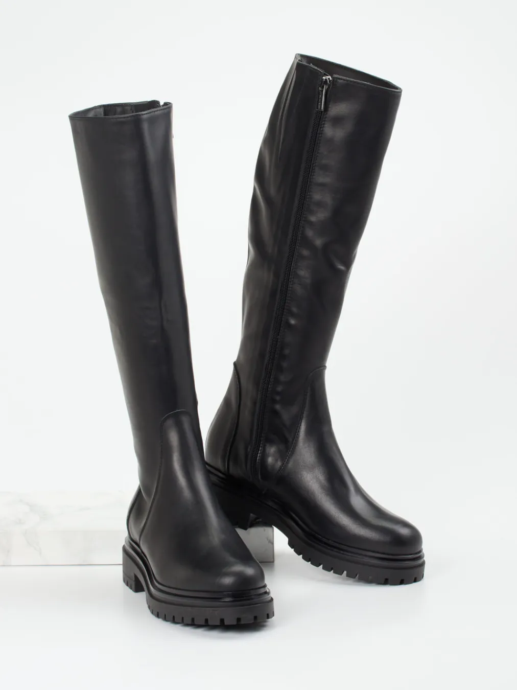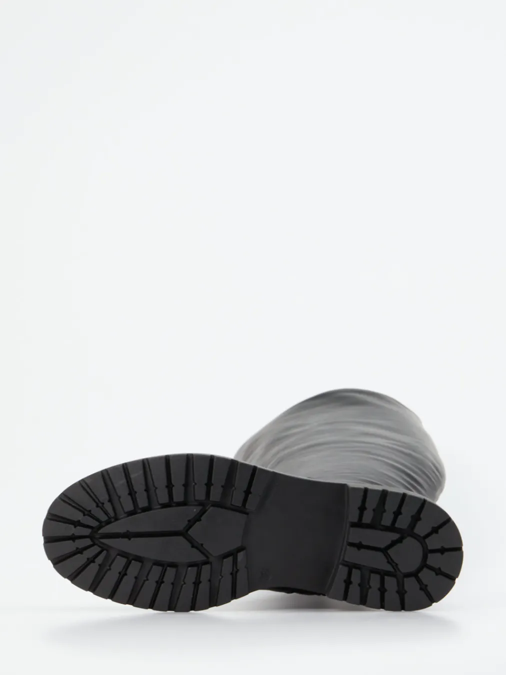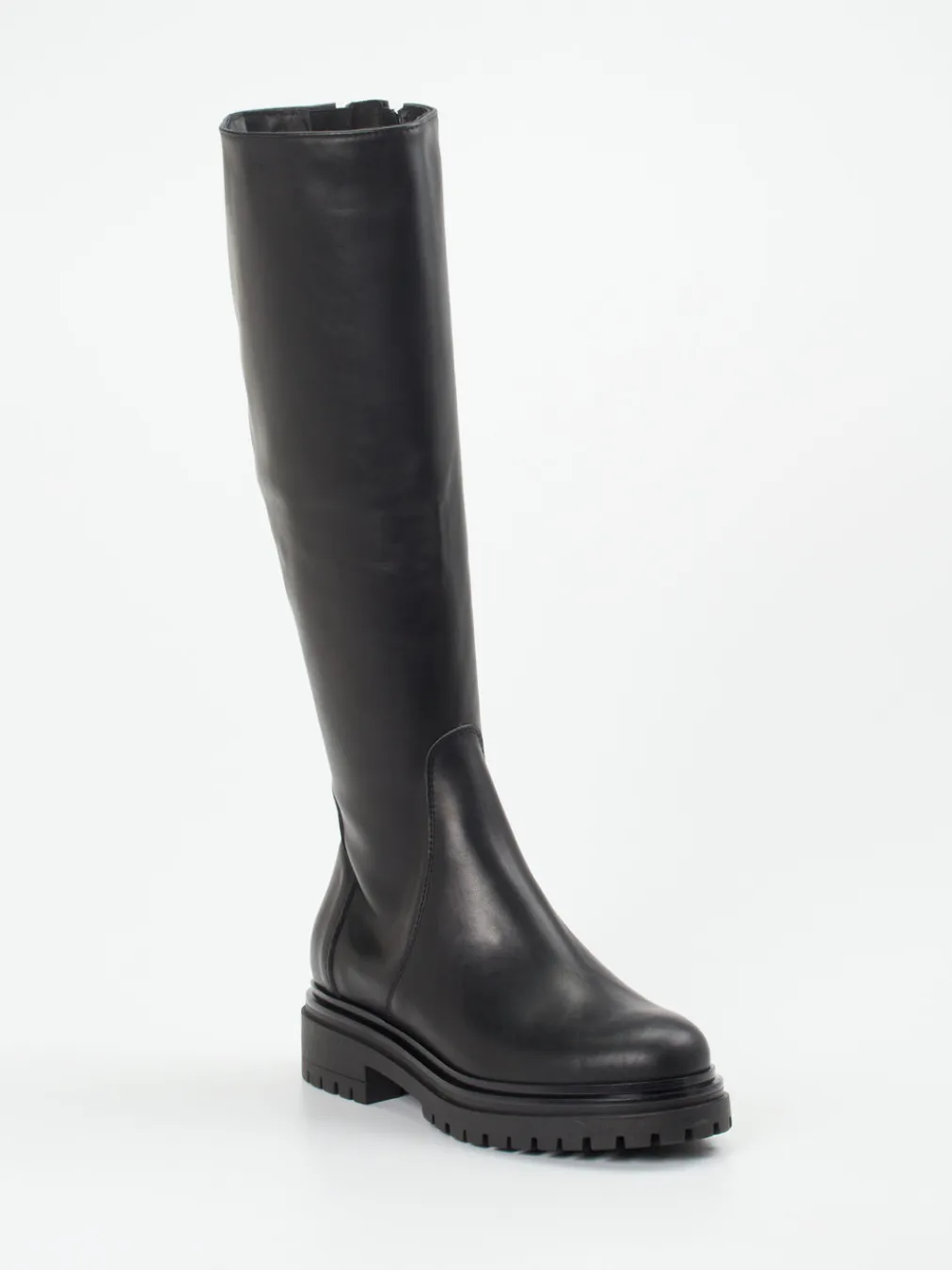 Gefertigt aus geschmeidigem Kalbleder und ausgestattet mit einer robusten Profilsohle, verbinden diese kniehohen Stiefel reduziertes Design mit urbaner Funktionalität.