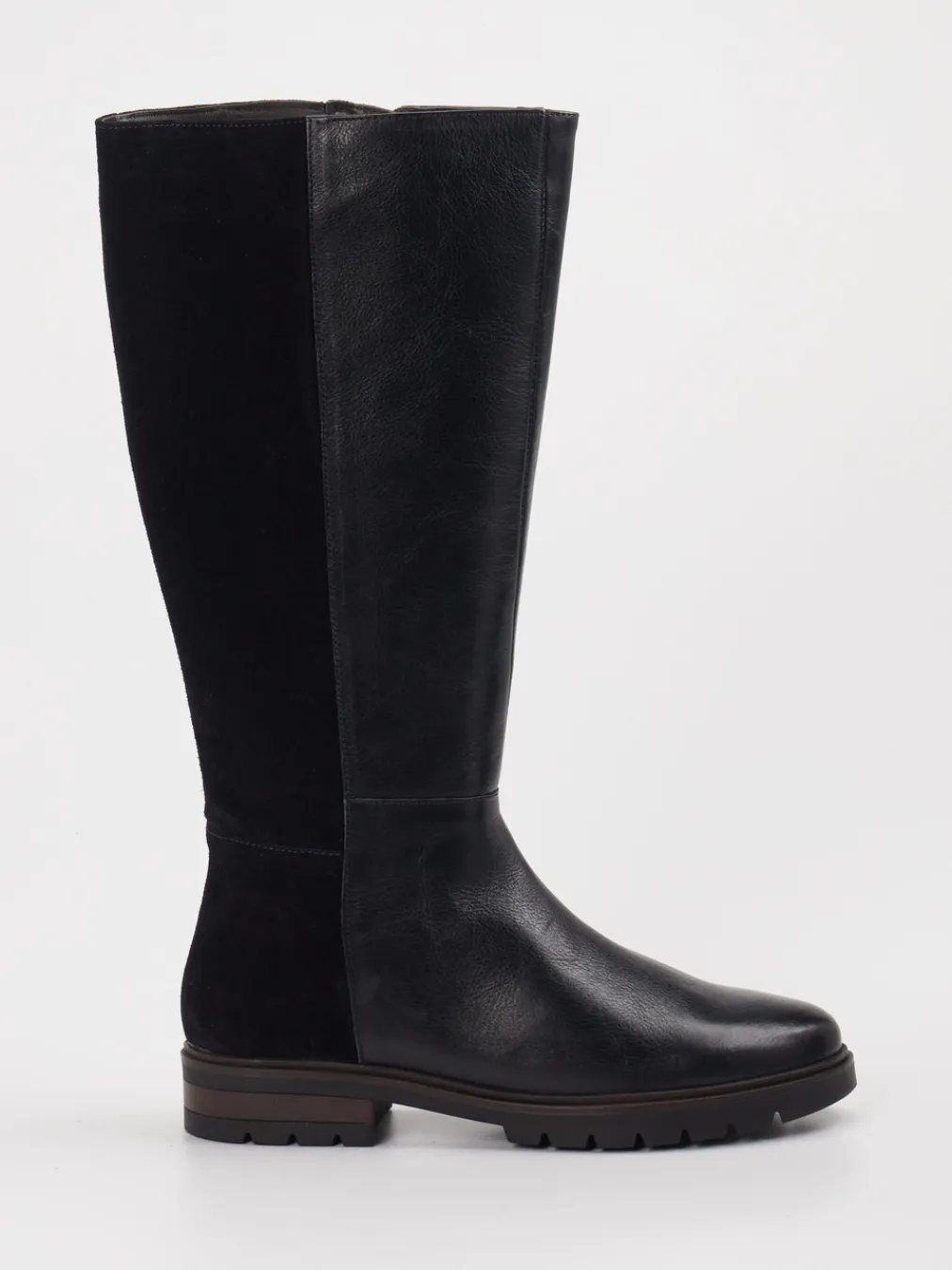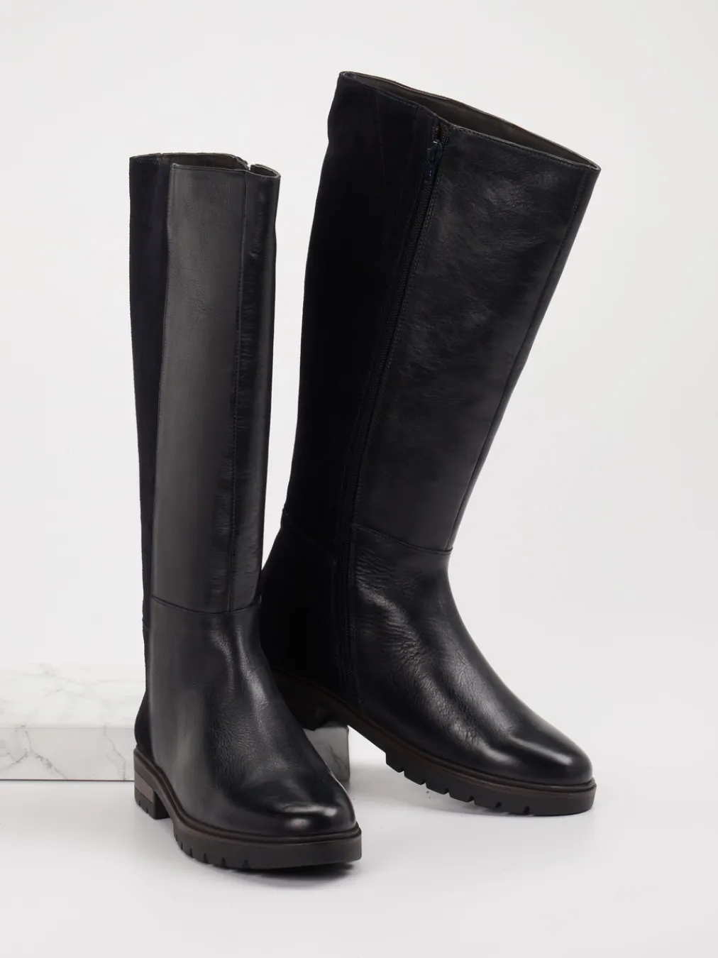 Schlicht. Funktional. Vielseitig.Ara präsentiert kniehohe Damenstiefel mit komfortabler Schaftweite im klassisch-minimalistischen Stil. Für den Weg ins Büro oder ausgedehnte City-Tage bieten diese schwarzen Stiefel eine gelungene Verbindung aus edlem Leder mit matter Rückseite und genarbter Frontoptik. Die Materialkombination aus Glatt- und Veloursleder harmoniert mit der geraden, leicht konischen Schaftform. Ein profilierter Gummiboden sorgt für Trittsicherheit, der innenliegende Reißverschluss für einfaches Anziehen. Die dezente Optik ohne sichtbare Markenprägung unterstreicht den „Quiet Luxury“-Trend. Ein stilvoller Favorit mit Ara-typischem Komfort – herbsttauglich, robust und cityfein zugleich.