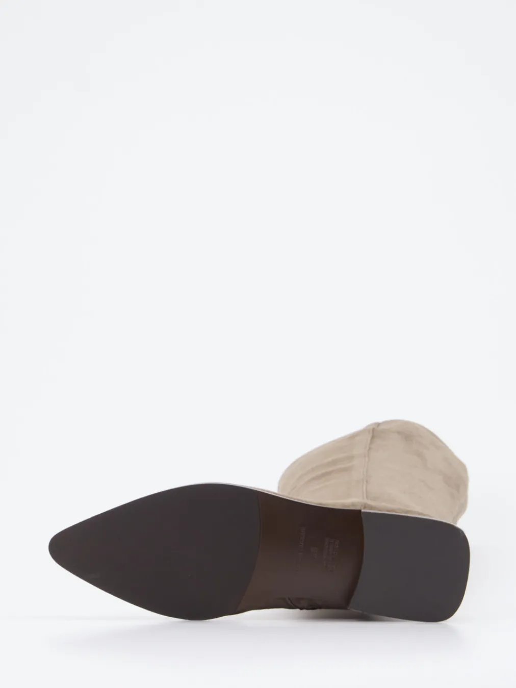 Kniehohe Eleganz trifft auf komfortable Alltagstauglichkeit: Der hochwertige Velourslederstiefel überzeugt durch klare Formensprache und dezente Farbstimmung im Zeichen des Quiet Luxury.
