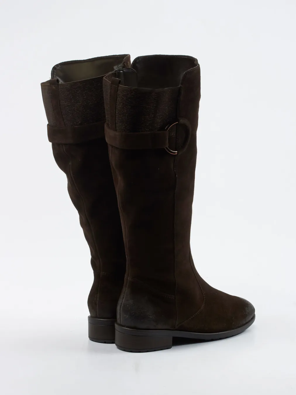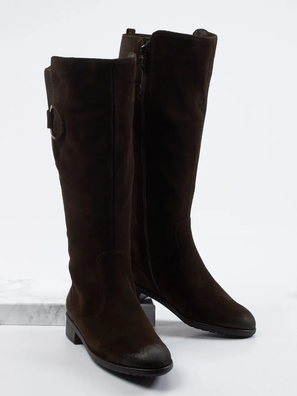 Dieser kniehohe Stiefel kombiniert samtiges Veloursleder mit einem elastischen Schaft für besseren Sitz. Zeitlose Details und funktionaler Komfort machen ihn vielseitig einsetzbar.