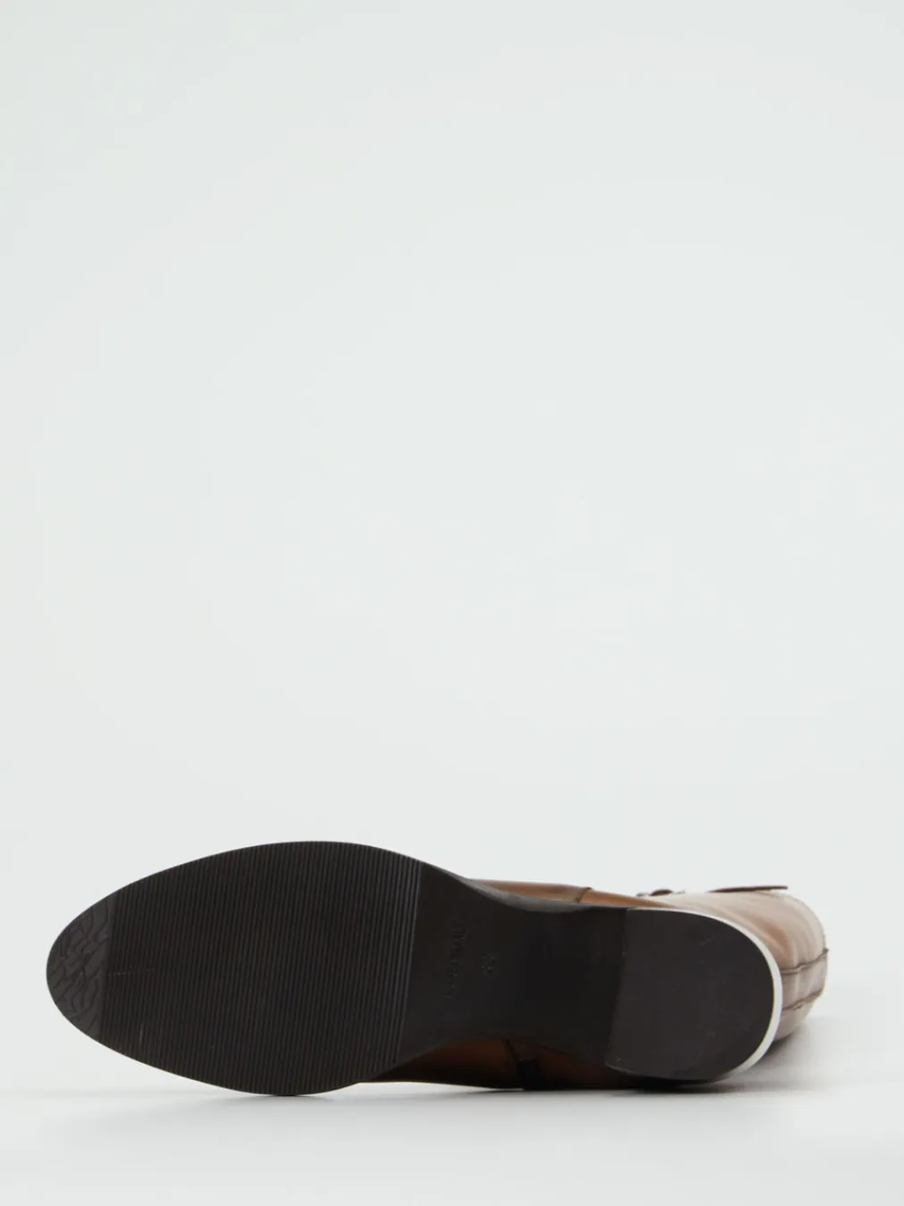Eleganter Damenstiefel aus glänzendem Kalbleder mit Reitstiefel-Anmutung. Die klassische Silhouette und dezente Details machen ihn vielseitig kombinierbar.