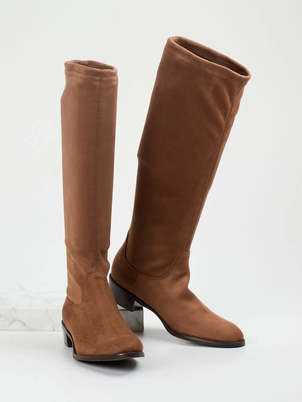 Andrea Puccini präsentiert einen stilvollen Damen-Kniestiefel für die Herbst-/Wintersaison. Der flexible Pull-on-Stiefel wurde aus dehnbarem Stretch-Material mit samtiger Veloursoptik gefertigt und überzeugt in einem weichen Braunton. Das vegane Obermaterial schmiegt sich angenehm an das Bein und wirkt durch die schmal zulaufende Silhouette besonders elegant. Ein elastischer Schaft und die gepolsterte Innensohle sorgen für guten Tragekomfort, während der dezent gehaltene Blockabsatz einen stabilen Auftritt garantiert. Perfekt kombinierbar zu Strickkleidern oder minimalistischen Business-Outfits. Ein herbsttauglicher Klassiker mit modern-akzentuierter Linienführung.
