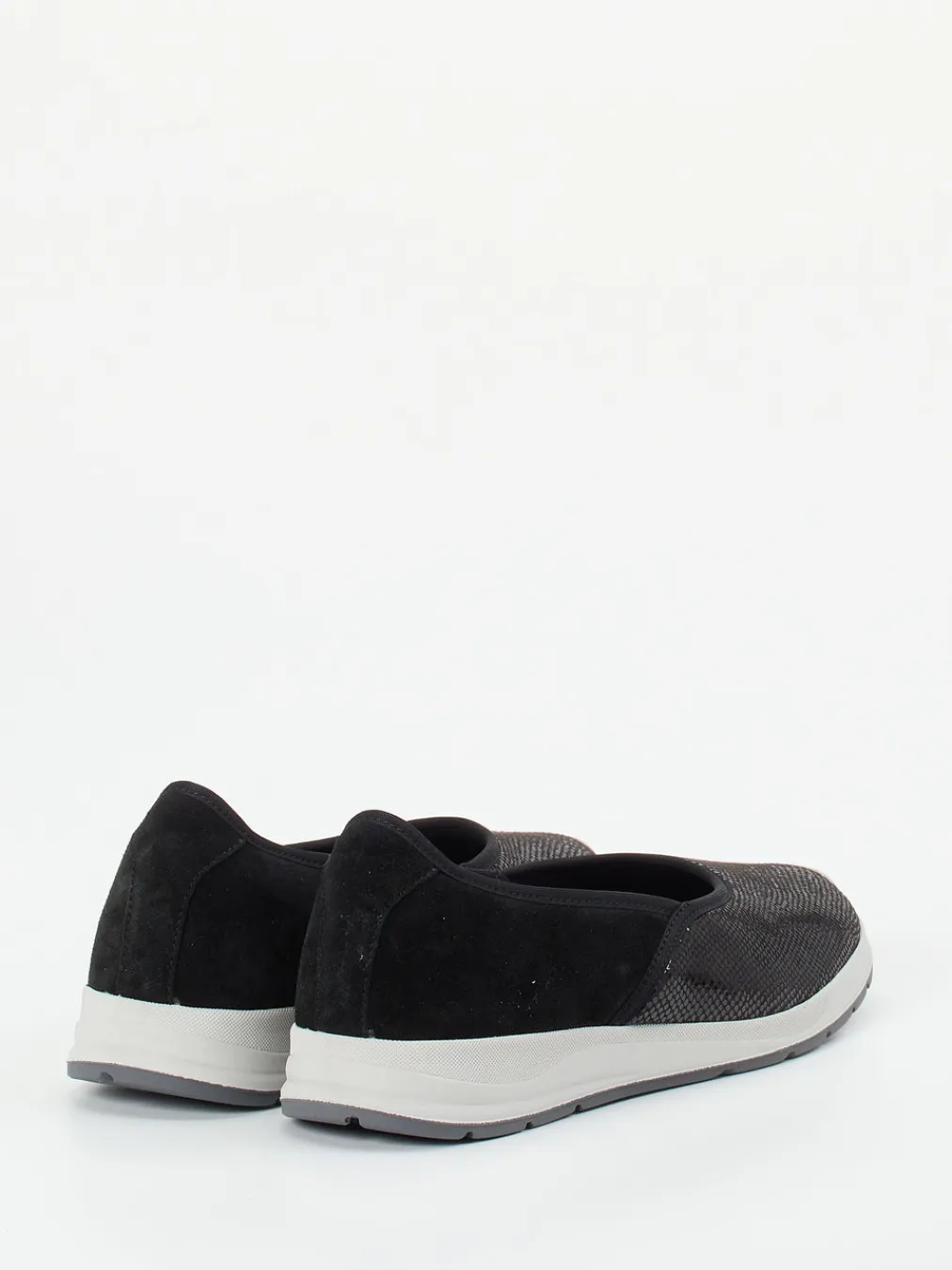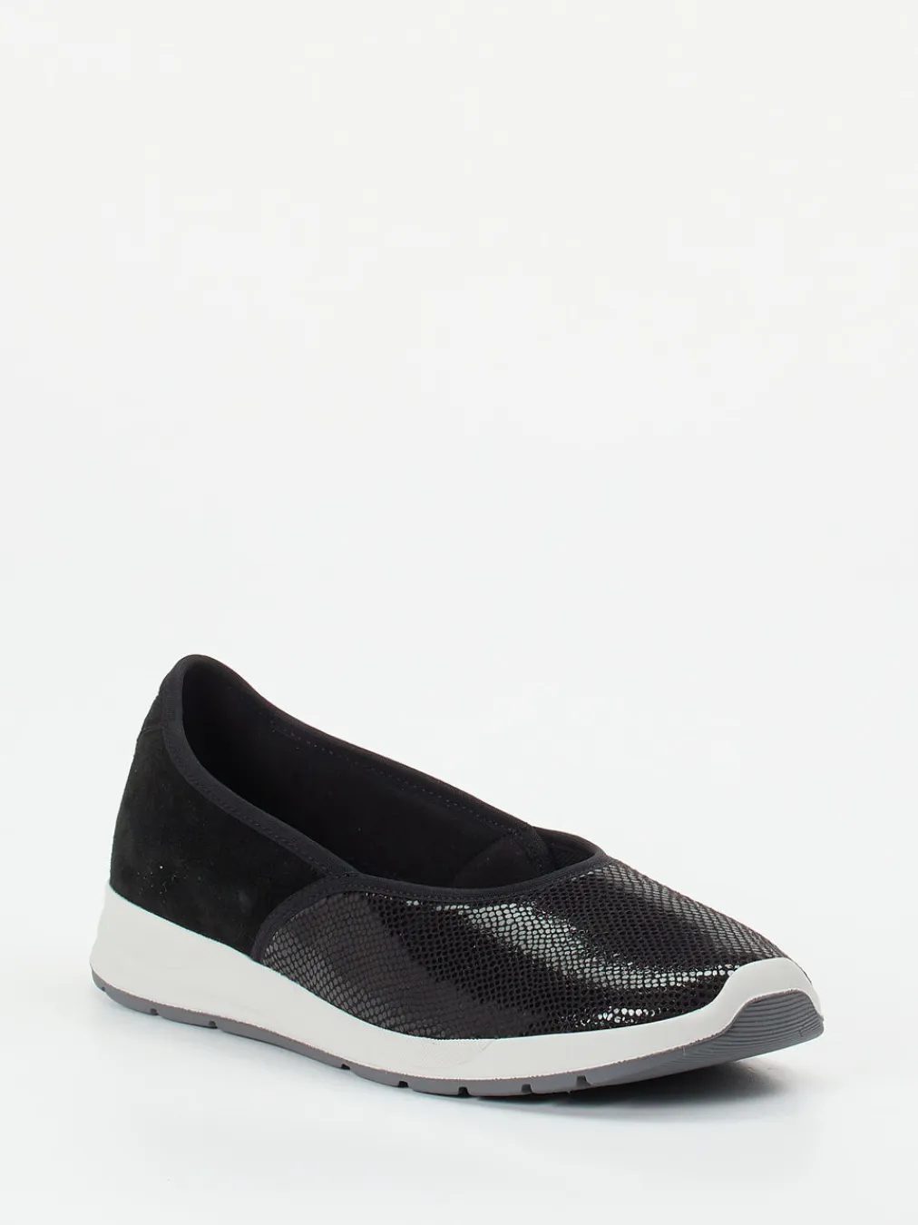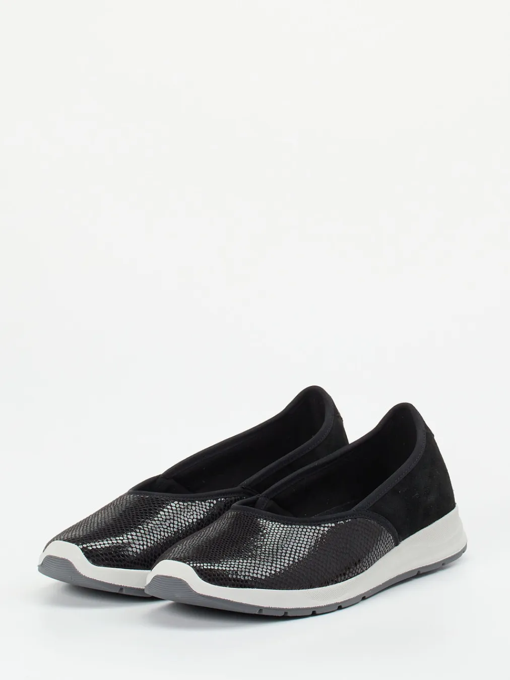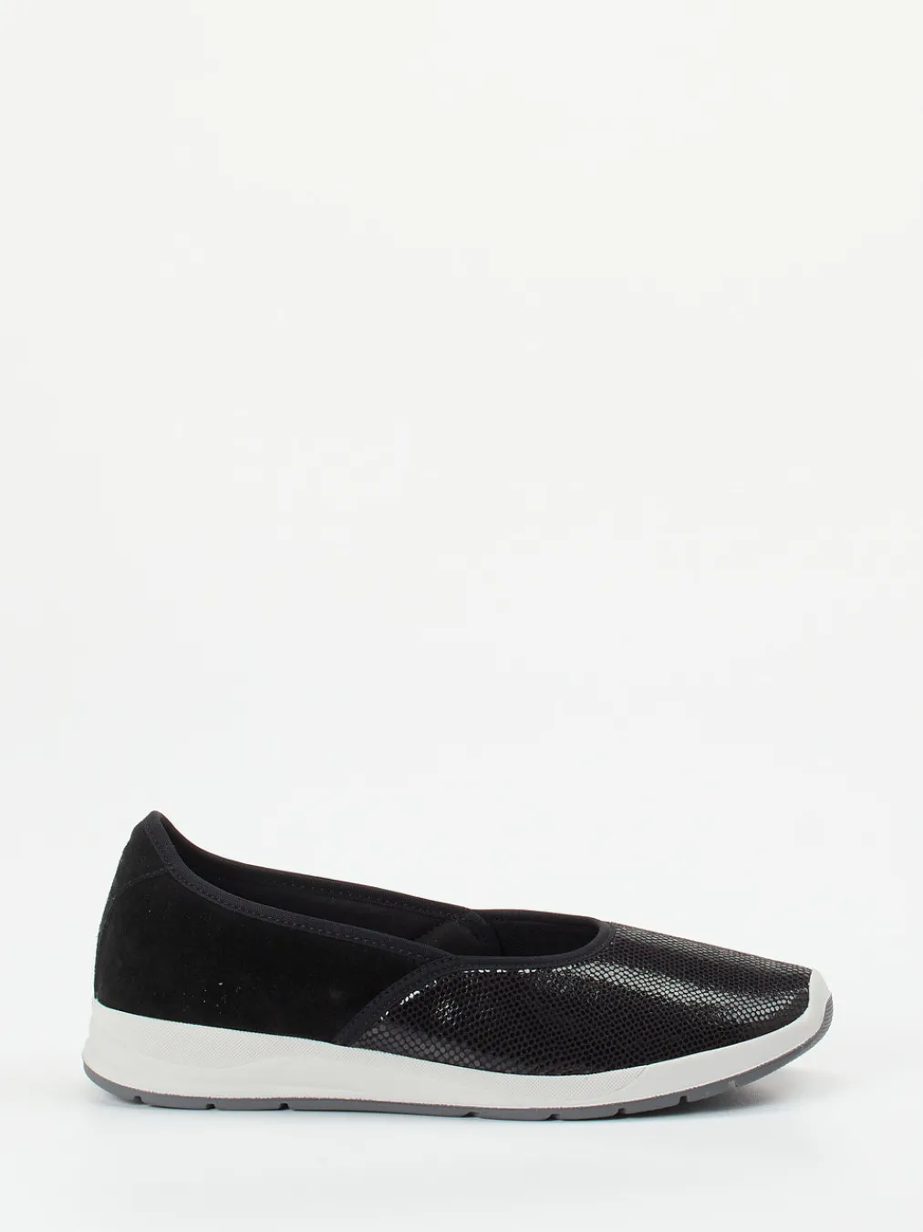 Flexibilität trifft moderne Eleganz.Varomed präsentiert mit diesem Komfort-Ballerina ein Modell, das Alltagstauglichkeit mit dezenter Raffinesse vereint. Ideal für lange Tage auf den Beinen: Das weiche Stretchmaterial passt sich sensiblen Füßen individuell an und wird im Fersenbereich durch samtig angeschliffenes Veloursleder ergänzt. Die schwarz-graue Farbkombination unterstreicht den ruhigen Look, während die glänzende Reptilprägung am Vorderfuß einen stilvollen Akzent setzt. Die profilierte Gummisohle bietet sicheren Halt, das gepolsterte Fußbett erhöht den Tragekomfort zusätzlich. Schlupfform und flache, gerundete Silhouette unterstreichen das minimalistische Design mit Quiet-Luxury-Attitüde. Kombiniert mit schlichten Basics entsteht ein angenehmes, urbanes Outfit. Varomed steht für durchdachte Funktionalität mit gesundheitsschonendem Komfort.