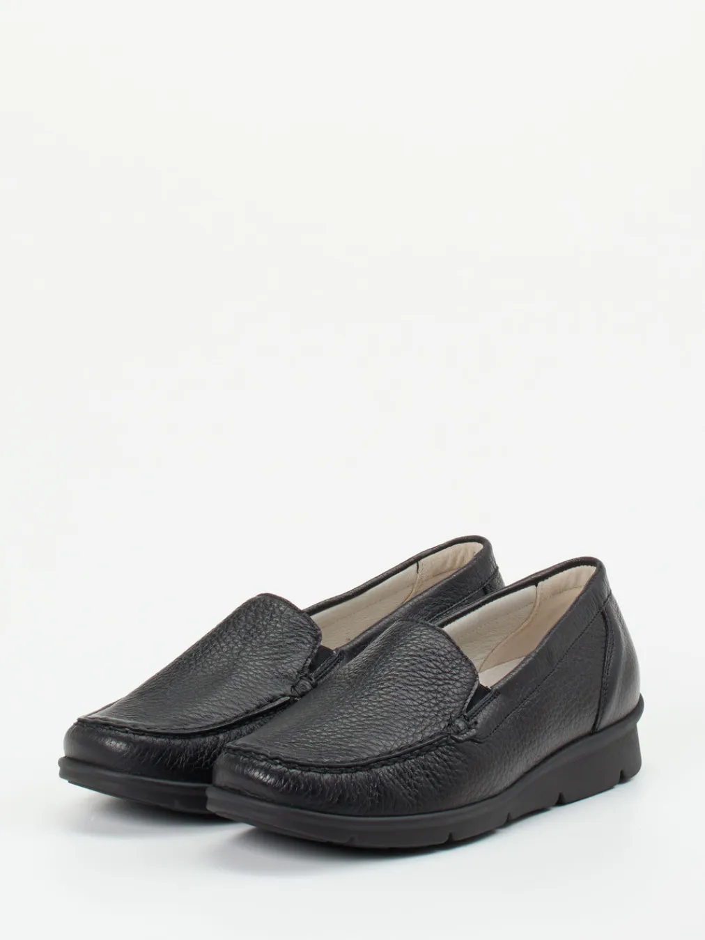 Perfekt bei langen Tagen, bietet das weiche, genarbte Elchleder ein wertiges Tragegefühl und passt sich angenehm dem Fuß an. Die klassische Mokassinnaht unterstreicht die flache, minimalistische Form in dezentem Schwarz. Dank seitlicher Elastikeinsätze wird das An- und Ausziehen erleichtert. Die profilierte Luftpolstersohle wirkt stoßdämpfend und verleiht Stabilität auf jedem Untergrund. Ein herausnehmbares Fußbett bietet Raum für individuelle Einlagen. Die Gestaltung folgt dem Trend ‚Quiet Luxury‘ – unaufdringlich, komfortorientiert, stilvoll kombinierbar.
