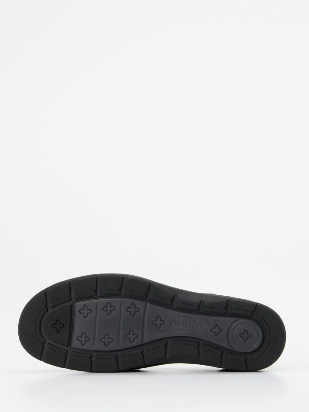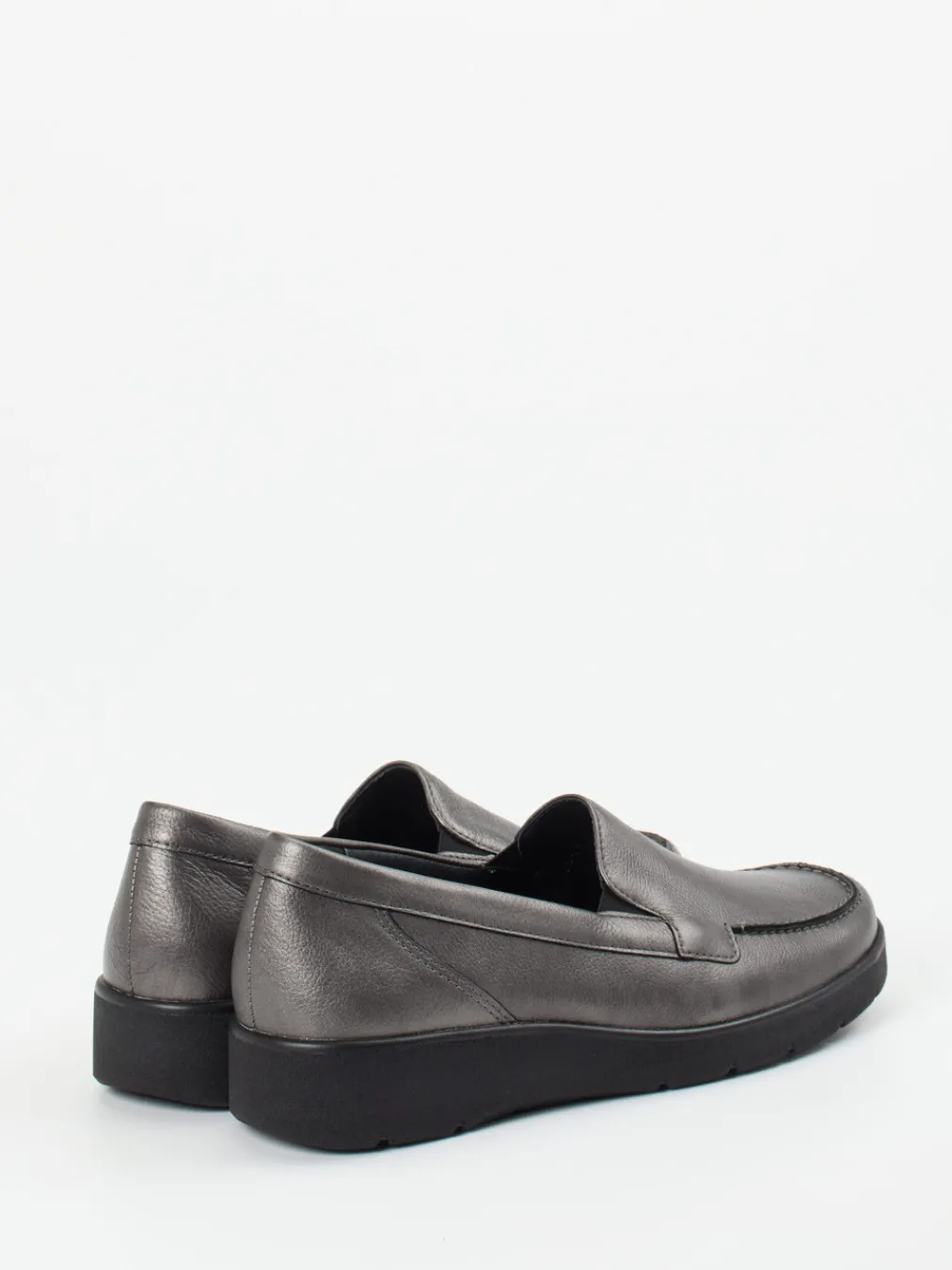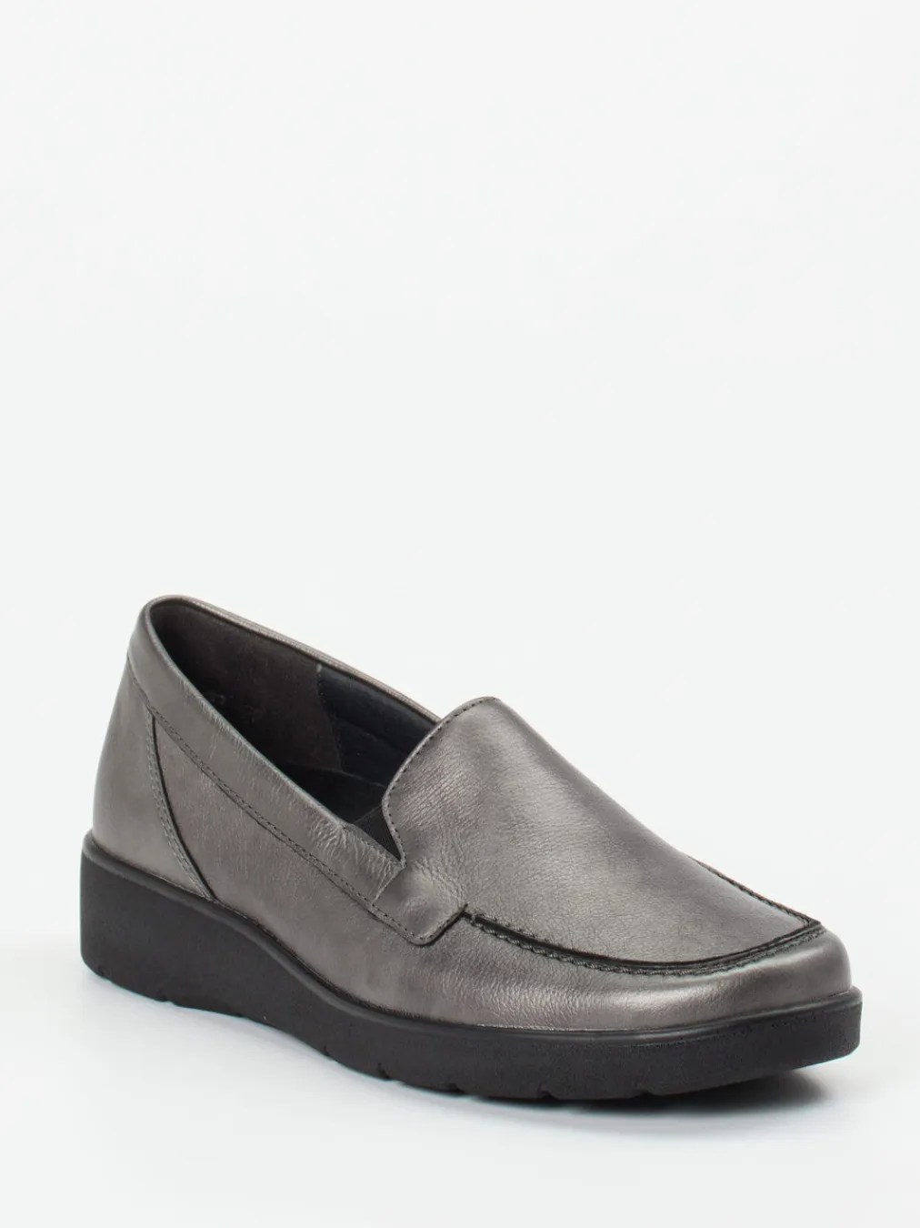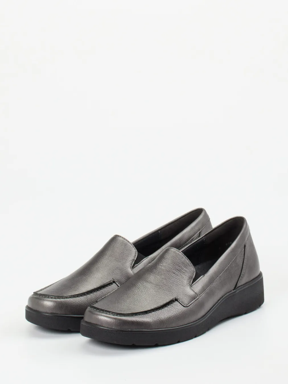 Eleganz und Komfort im Büroalltag.Semler präsentiert einen Damen-Komfort-Loafer in Weite H – gefertigt aus grauem Kalbleder mit fein genarbter Oberfläche und einem dezenten Metallic-Finish. Ideal für lange Arbeitstage und den stilvollen Alltag: Die flexible PU-Sohle mit integrierter Luftpolsterung bietet angenehmen Laufkomfort, während das klassische, leicht abgerundete Design durch seitliche Ziernähte und Ton-in-Ton-Verarbeitung unterstrichen wird. Die schlupffreundliche Form mit Elasteinsätzen erleichtert das Anziehen und gewährleistet sicheren Halt. Das Modell greift den Trend „Quiet Luxury“ gekonnt auf und lässt sich wunderbar zu Business-Outfits oder minimalistischer Casualwear kombinieren. Zeitlose Stilistik mit semler-typischem Tragekomfort.