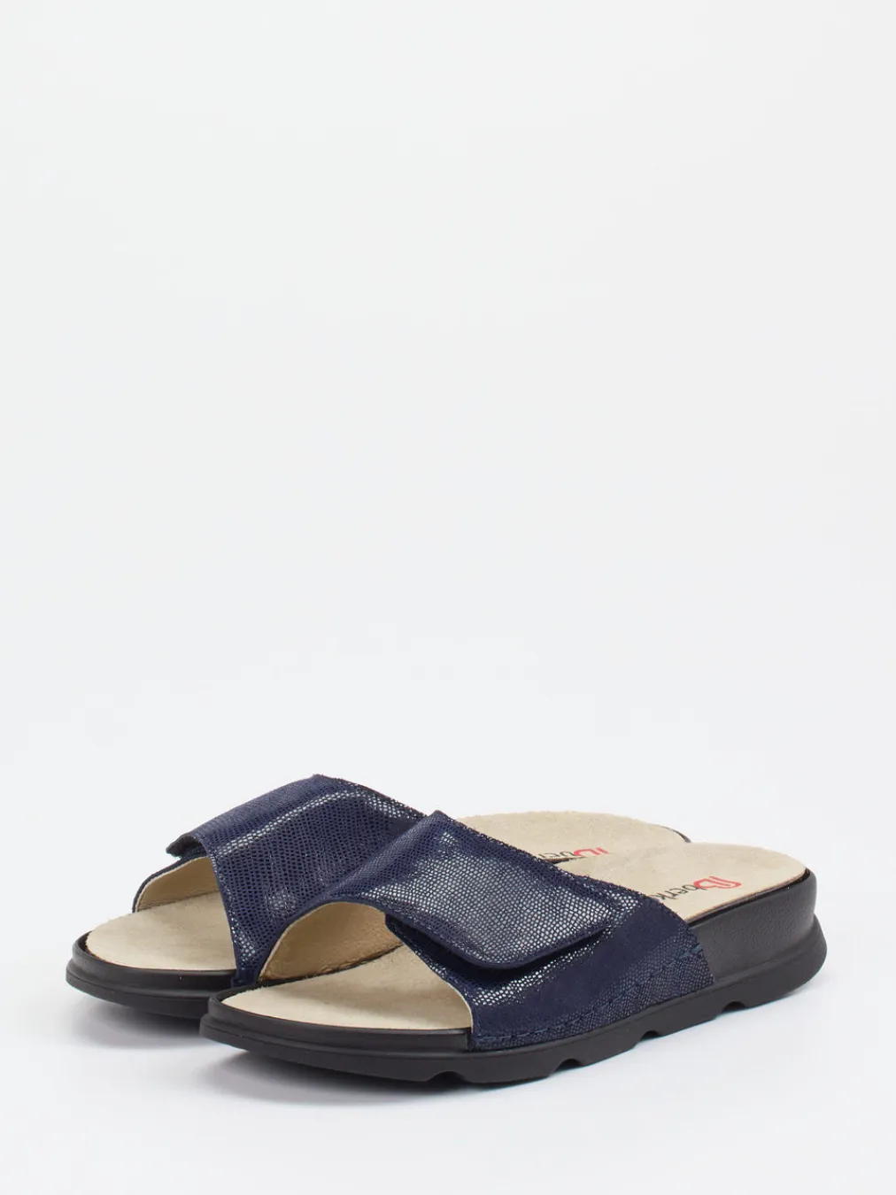 Schimmernder Komfort für jeden Tag.Die Marke Berkemann steht für durchdachte Bequemschuhe – diese Damen-Pantolette ist ein gutes Beispiel. Ob beim Frühstück auf der Terrasse oder beim gemütlichen Stadtbummel: Das geprägte Leder in tiefem Dunkelblau mit dezentem Glanz und Ton-in-Ton-Nähten verleiht dieser offenen, ergonomisch geformten Sandale ihr modernes Erscheinungsbild. Zwei Klettverschlüsse sorgen für optimalen Sitz, die gepolsterte Innensohle ist mit Veloursleder bezogen und eignet sich auch für eigene Einlagen. Die leichte PU-Sohle gibt Halt und unterstützt beim Gehen. Design und Funktion folgen dem Trend zu „Functional Footwear“ mit minimalistischer Eleganz. Berkemann überzeugt mit alltagstauglicher Ergonomie und hochwertiger Verarbeitung.