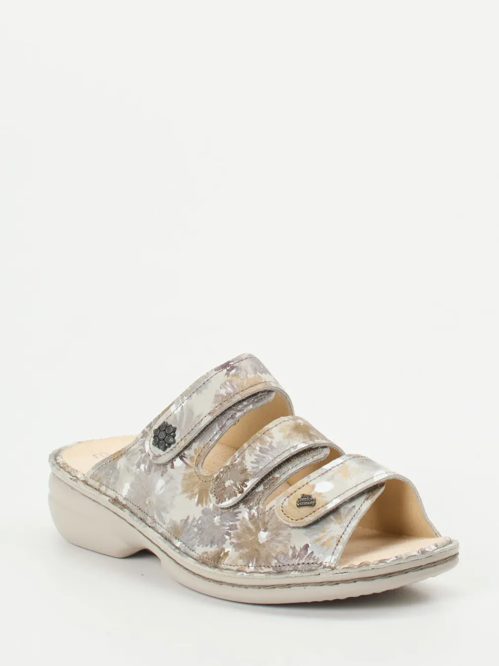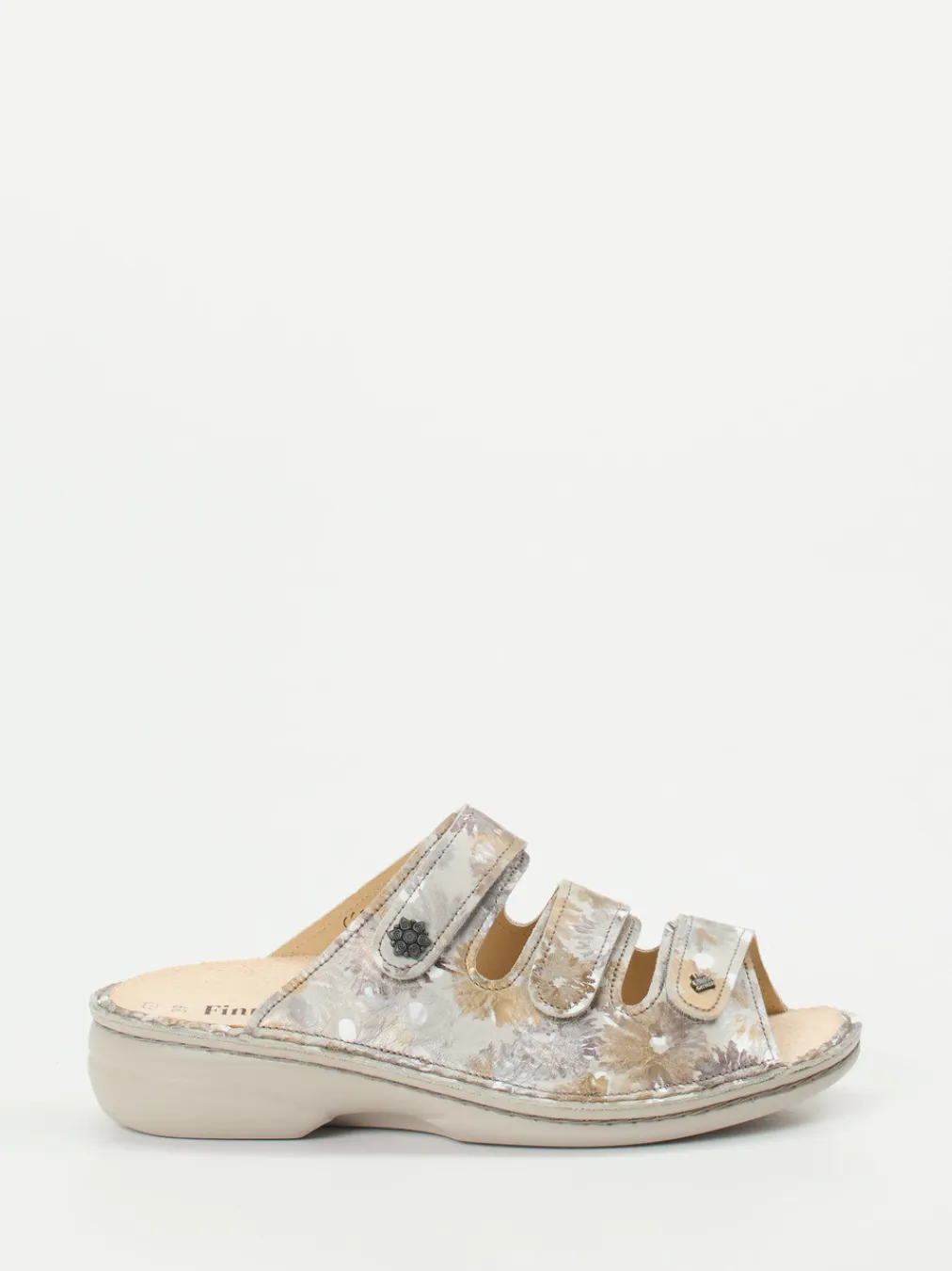 Ob bei einem entspannten Tag zu Hause oder einem Spaziergang im Park – das geprägte Leder mit floralem Muster bietet optische Raffinesse und angenehmes Tragegefühl. Die drei Klettverschlüsse ermöglichen eine variable Anpassung, während das lederbezogene, ergonomisch geformte Korkfußbett austauschbar ist – auch für eigene Einlagen geeignet. Die offen gestaltete, beigefarbene Silhouette wird durch Zierknöpfe in Metalloptik und dezente Kontrastnähte ergänzt. Die rutschhemmende PU-Sohle mit leichtem Keilabsatz sorgt für Sicherheit bei jedem Schritt. Perfekt kombinierbar mit luftiger Sommermode.