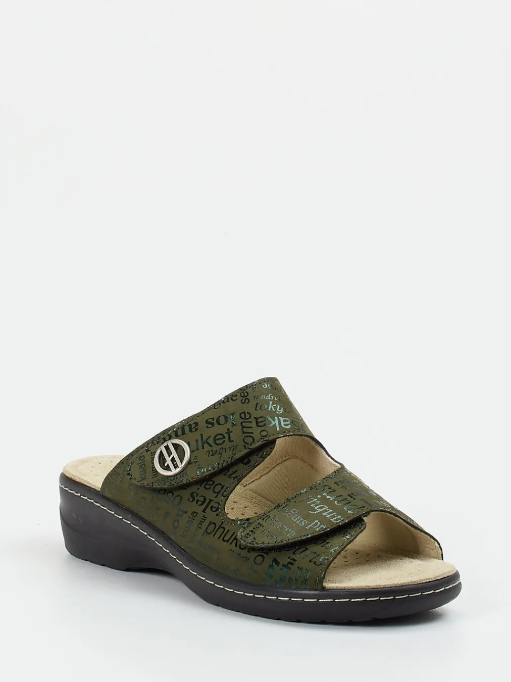 Komfortabel unterwegs – stilvoll und ergonomisch.Die Marke Hickersberger präsentiert mit dieser Komfort-Pantolette ein alltagsfreundliches Modell für Damen. Für entspannte Schritte im Alltag sorgt das geprägte Leder mit Olivgrün und subtil schimmernden Schriftzügen. Die offene, ergonomisch geformte Silhouette mit zwei verstellbaren Klettverschlüssen passt sich individuell an. Eine silberne Agraffe akzentuiert das Design. Das bewährte Kräuter-Fußbett mit Korkunterbau und Ledersohle sowie die rutschhemmende PU-Keilsohle mit Kontrastnaht garantieren hohen Komfort. Ideal für Freizeitlooks, etwa zur Leinenhose oder Sommerbluse. Ein femininer Wohlfühlschuh mit komfortorientierter Marken-DNA.