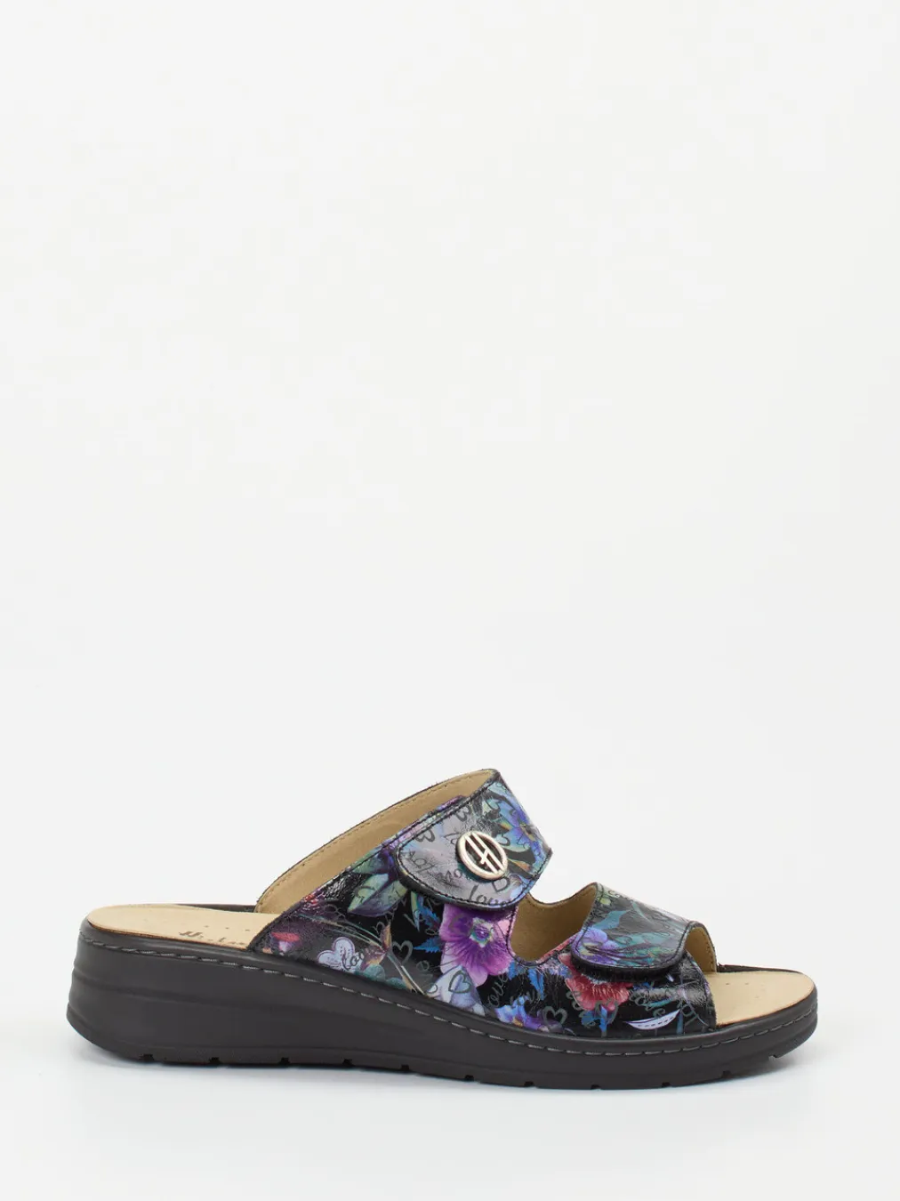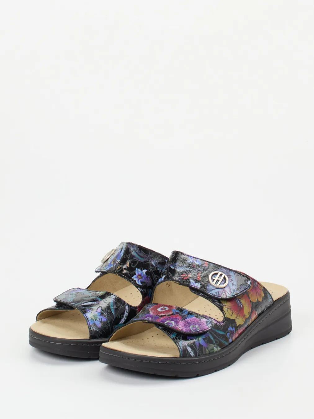 Ein feminines Komfort-Statement: Diese Pantolette verbindet ein ergonomisches Kräuter-Fußbett mit floral glänzendem Design und funktionalem Klettsystem.