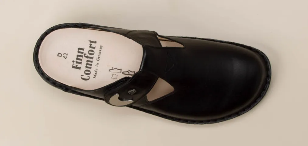 Komfort trifft Funktionalität.Finn Comfort präsentiert mit dieser Damen-Pantolette ein Modell der Classic-Linie für den Alltag. Die Komfort-Pantolette begleitet durch entspannte Momente zu Hause oder beim Freizeitbummel. Gefertigt aus hochwertigem, mattschwarzem Kalbleder mit silberfarbener Zierschnalle, überzeugt sie durch funktionalen Minimalismus. Der verstellbare Klettverschluss sorgt für flexible Anpassung, das ergonomische Kork-Fußbett für gesunden Stand – auch für eigene Einlagen geeignet. Die Gummisohle mit leichtem Keilprofil bietet guten Halt. Ein langlebiger Bequemschuh für Relax-Styles und Slow Fashion Looks – gefertigt mit Anspruch an Qualität und Komfort.