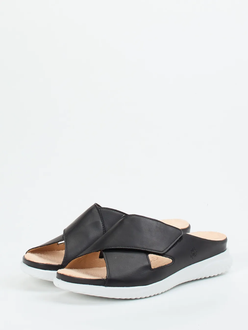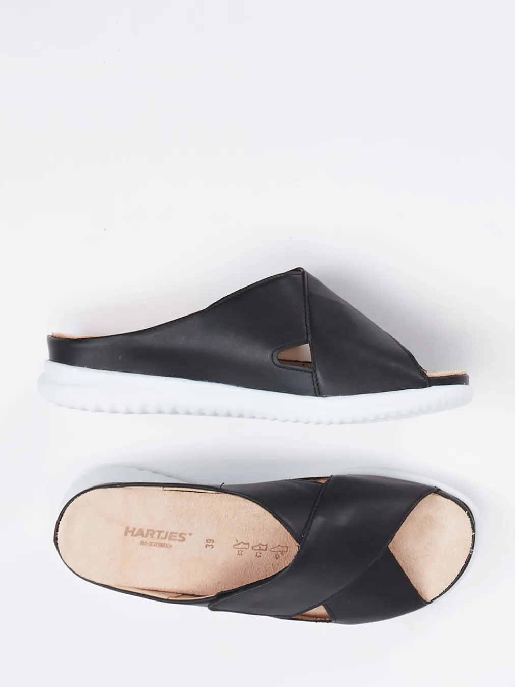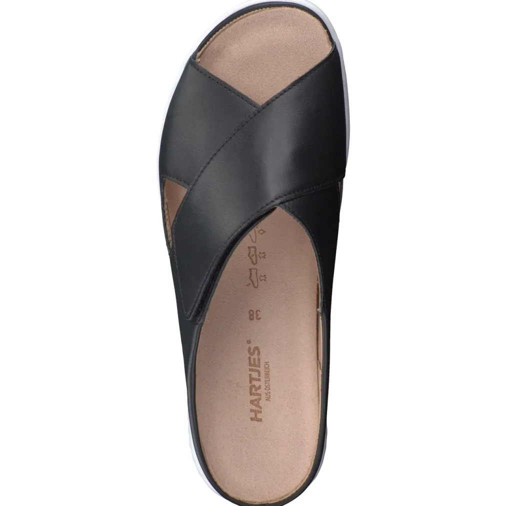 Alltag leicht gemacht.Die Marke Hartjes präsentiert diese komfortable Damen-Pantolette. Ideal für entspannte Stunden zuhause oder in der Freizeit – dank ergonomischem, lederbezogenem Korkfußbett bietet dieses Modell angenehme Unterstützung. Schwarzes, weich verarbeitetes Kalbleder mit matter Oberfläche und Ton-in-Ton-Nähten trifft auf überkreuzte Riemen mit Klettverschluss für individuelle Passform. Die weiße Gummisohle mit leichtem Keil sorgt für sicheren Stand und integriert sich harmonisch in das puristische Design. Stilistisch schwingt ein Hauch von „Quiet Luxury“ mit. Funktion trifft auf reduzierte Ästhetik – Hartjes-Komfort in Bestform.