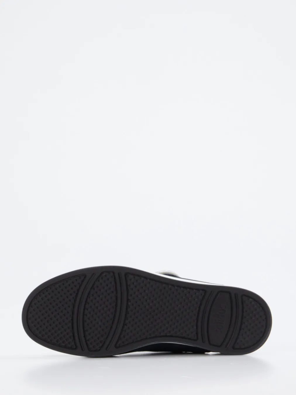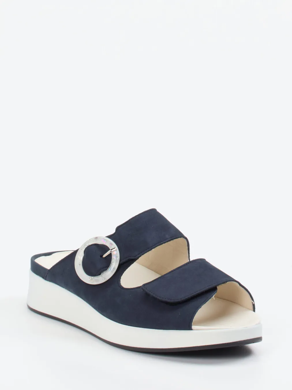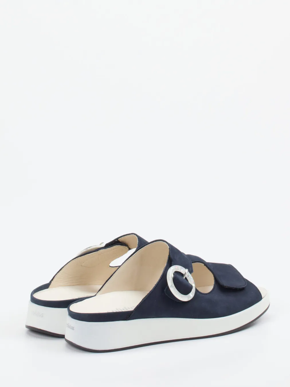 Diese Damen-Komfort-Pantolette von Solidus bietet ausgezeichneten Tragekomfort für Alltag und Freizeit. Das navyblaue Nubukleder liegt dank samtiger Oberfläche weich am Fuß und harmoniert mit der offen ergonomischen Form. Zwei verstellbare Klettverschlüsse sorgen für individuell anpassbaren Sitz, unterstützt durch eine große Rundschnalle in Perlmuttoptik mit silberfarbenen Details. Das austauschbare Luftpolster-Fußbett und die verstärkte Gummisohle gewährleisten gelenkschonendes Gehen und sicheren Halt – auch bei besonderen Fußbedürfnissen. Modisch fügt sich die Sandale in den Trend „Quiet Luxury“. Kombinierbar mit luftiger Stretchhose oder Cardigan für entspannte Sommermomente. Qualität und Komfort vereint im puristischen Solidus-Design.