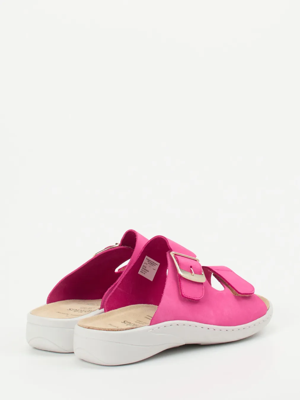 Wellnessgefühl mit Statement-Farbe.Die Komfort-Pantolette von Solidus kombiniert hochwertige Verarbeitung mit trendbewusstem Design. Ob beim Entspannen zu Hause oder beim Spaziergang im Alltag – das weich strukturierte Nubukleder in kräftigem Pink wirkt feminin und modern. Zwei verstellbare Riemen mit Klettverschluss, eine goldfarbene Schnalle und ein gepolstertes, lederbezogenes Korkfußbett sorgen für optimalen Halt und Bequemlichkeit. Die ergonomisch geformte Silhouette und die rutschhemmende PU-Sohle unterstreichen die funktionale Seite des Schuhs. Perfekt im „Barbiecore“-Trend mit Leinenhose und Strickjacke kombinierbar. Solidus bietet zeitlosen Komfort mit modischer Aussagekraft.