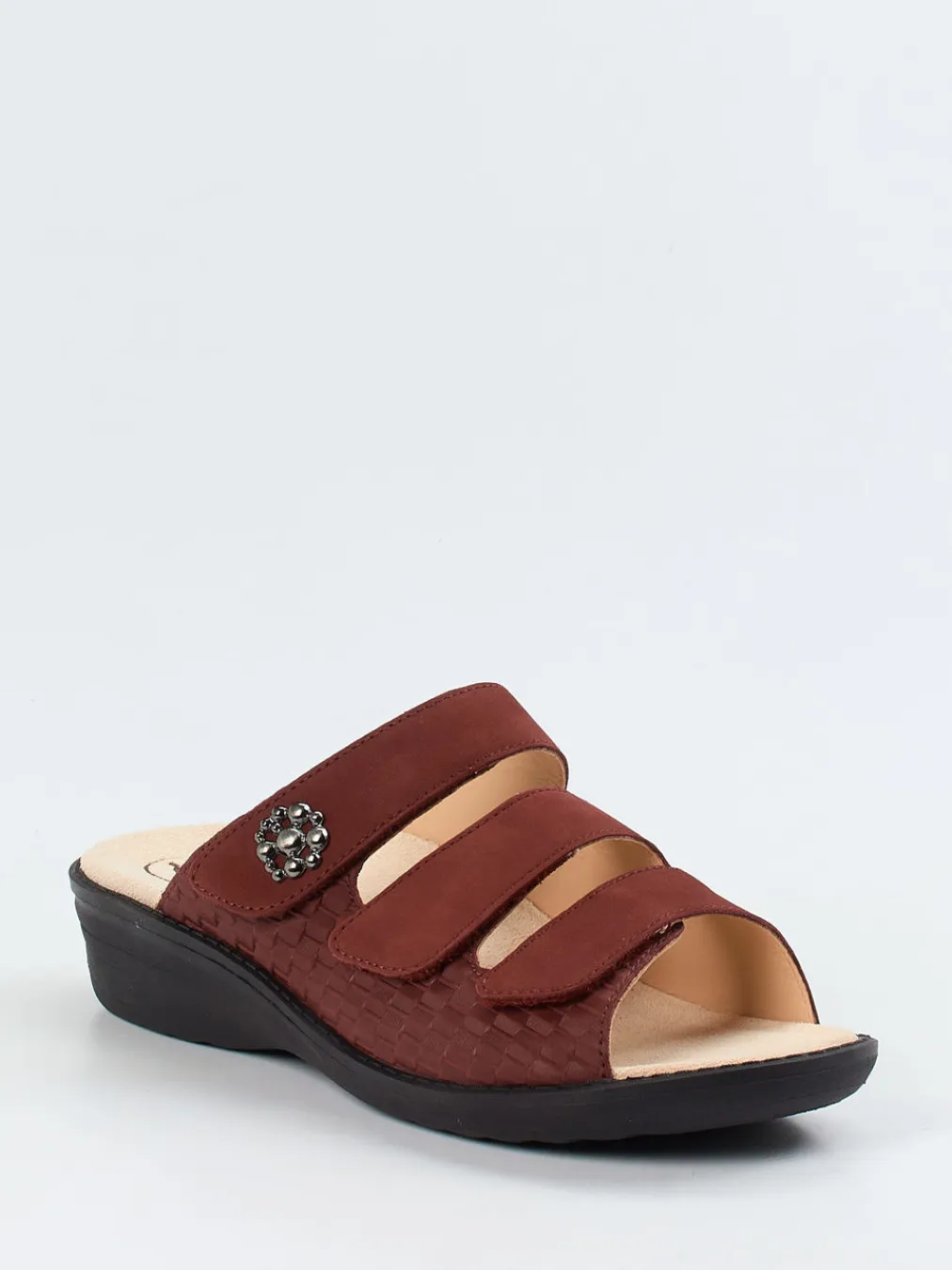 Nutzerfreundlich und formschön: Für entspannte Tage zuhause oder beim Stadtbummel vereint diese Komfort-Pantolette von Ganter atmungsaktives Nubukleder mit samtig angeschliffener Textur. Die dezente Flechtprägung, das warme Weinrot und ein dekorativer Blütenknopf setzen elegante Akzente. Drei Klettverschlüsse und ein lederbezogenes Vario-Kork-Fußbett ermöglichen eine individuell einstellbare Passform. Ergonomisch geformt und mit gepolsterter Innensohle überzeugt sie stil- und komfortorientierte Trägerinnen. Besonders harmonisch zu entspannten Sommeroutfits mit Leinenhose oder Jerseyrock.