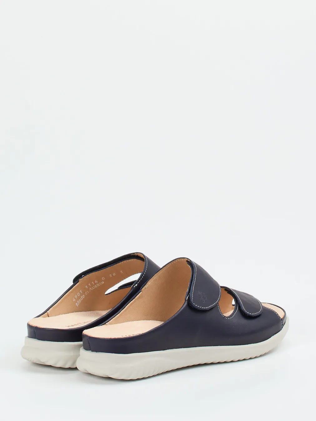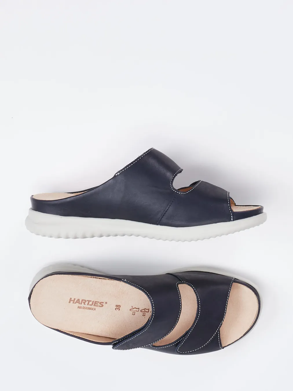 Maritimer Komfort für entspannte Alltagsmomente.Hartjes präsentiert diese bequeme Damen-Pantolette aus der Linie Breeze. Ob für einen kurzen Spaziergang oder zum Relaxen daheim – das weiche, mattes Kalbleder in Dunkelblau mit weißen Kontrastnähten sorgt für sportiv-frische Akzente. Das herausnehmbare, komfortabel lederbezogene Korkfußbett ist ergonomisch geformt und bietet gemeinsam mit der extraleichten, cremeweiß profilierten Gummisohle idealen Halt. Zwei breite Klettverschlüsse ermöglichen eine individuelle Passform. Der offene, ergonomische Schnitt trifft den Trend funktionaler Leichtigkeit im Sommer 2024. Markentypische Bequemlichkeit in stilvoller Verarbeitung – für Alltag mit Anspruch.