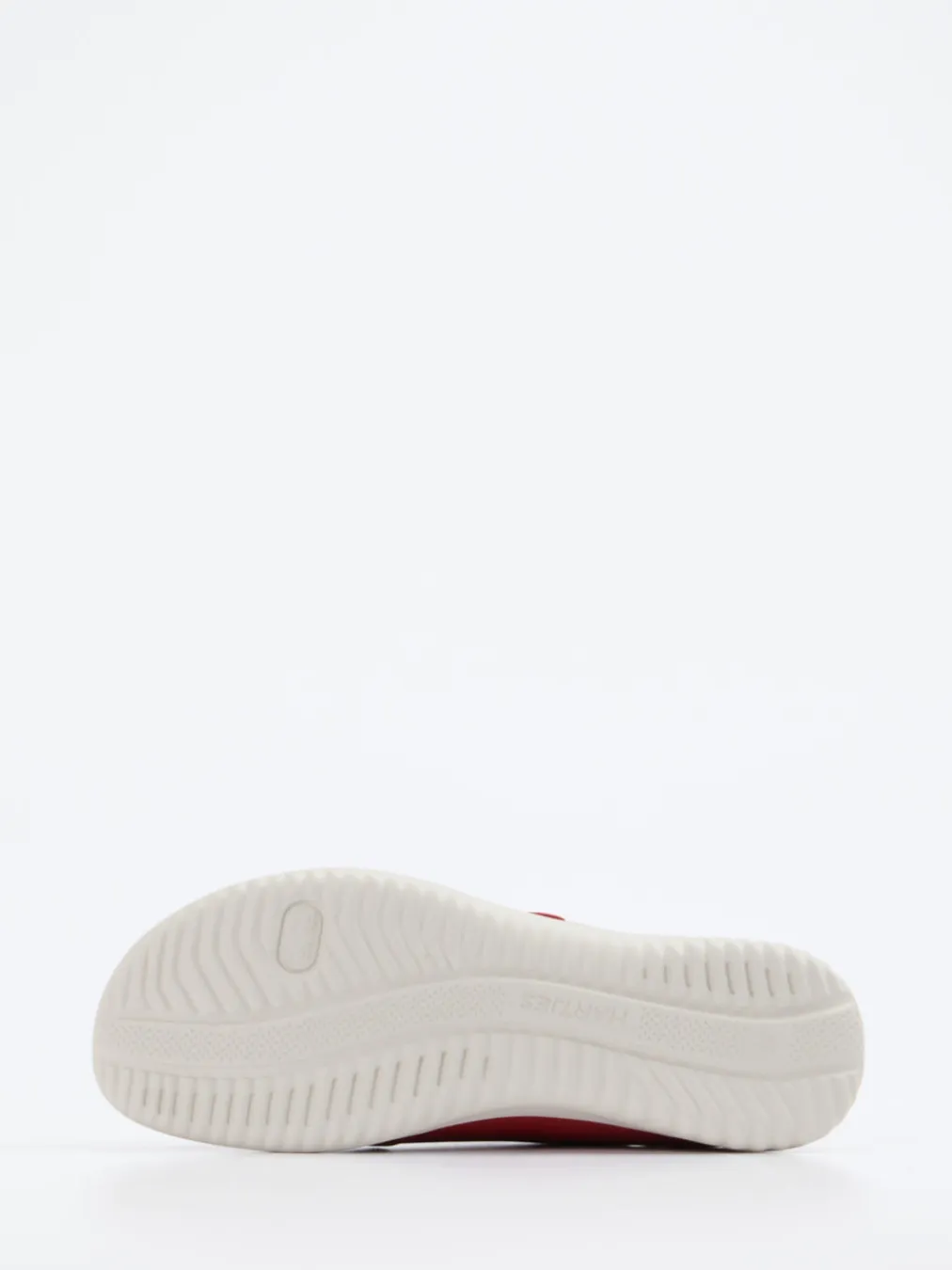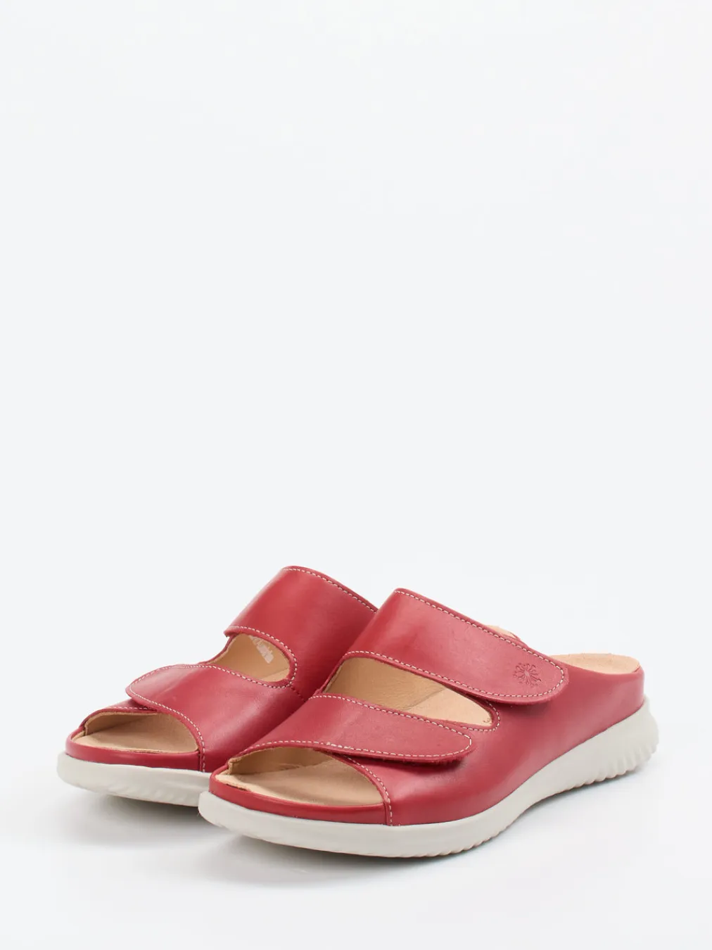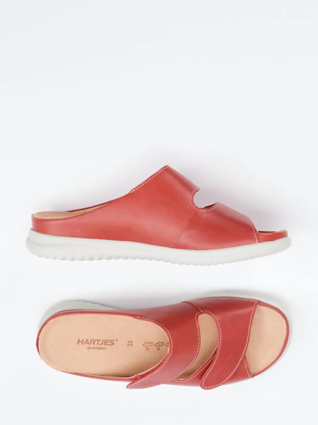 Für jeden Schritt bequem gewappnet.Die Marke Hartjes präsentiert eine komfortorientierte Damen-Pantolette in moderner Breeze-Form. Ein leichtes Laufgefühl für entspannte Sommertage bietet das handschuhweiche rote Kalbleder mit matter Oberfläche. Zwei individuell verstellbare Klettverschlüsse sorgen für optimalen Sitz. Das gepolsterte Leder-Kork-Fußbett unterstützt ergonomisch und lässt sich bei Bedarf gegen Einlagen austauschen. Dank griffiger Profilsohle eignet sich das Modell perfekt für Alltag und Zuhause. Dezente Ton-in-Ton-Nähte und ein geprägtes Logo runden das minimalistische Design stimmig ab. Komfort trifft auf Funktion – in gewohnt verlässlicher Hartjes-Qualität.