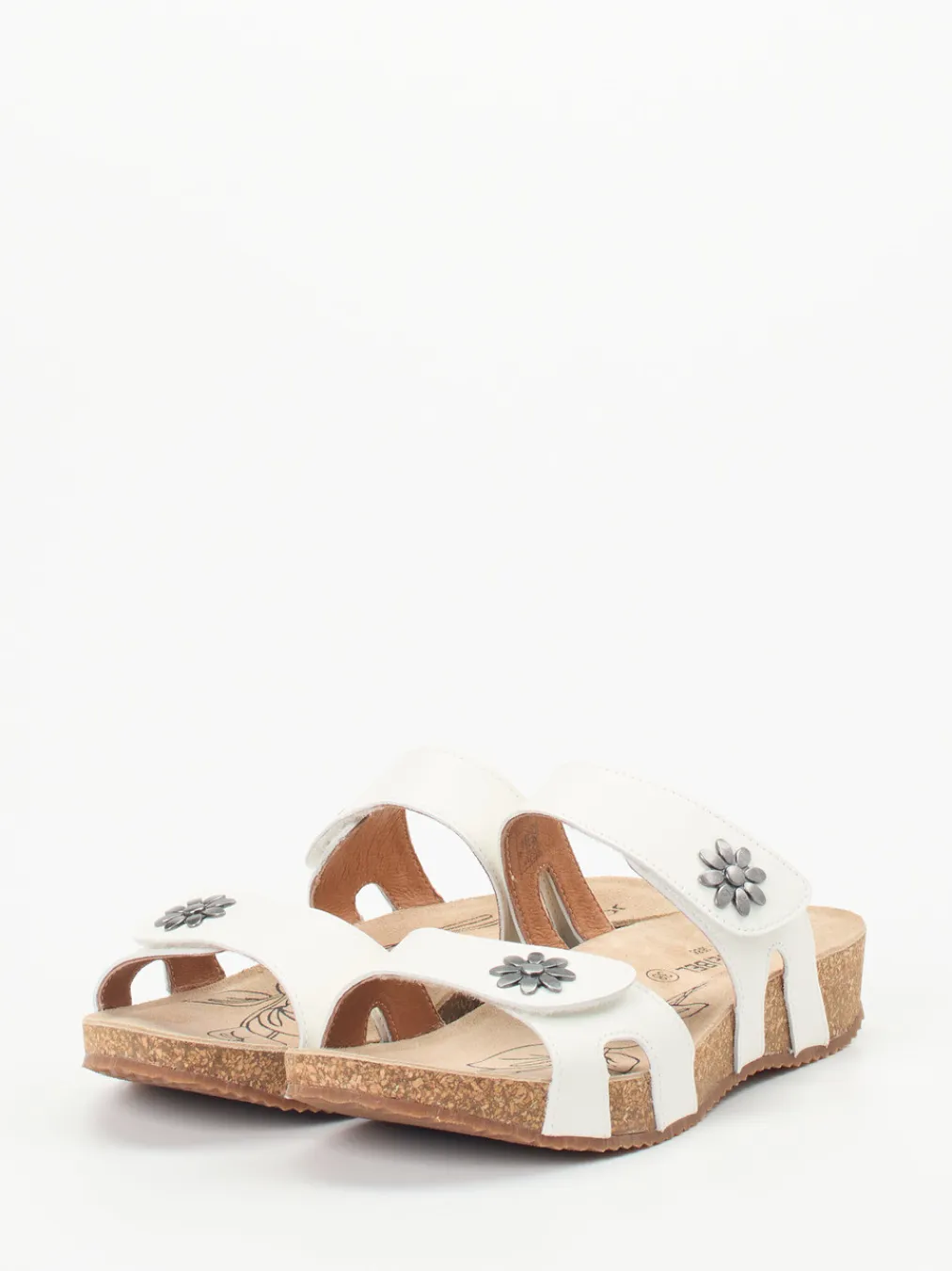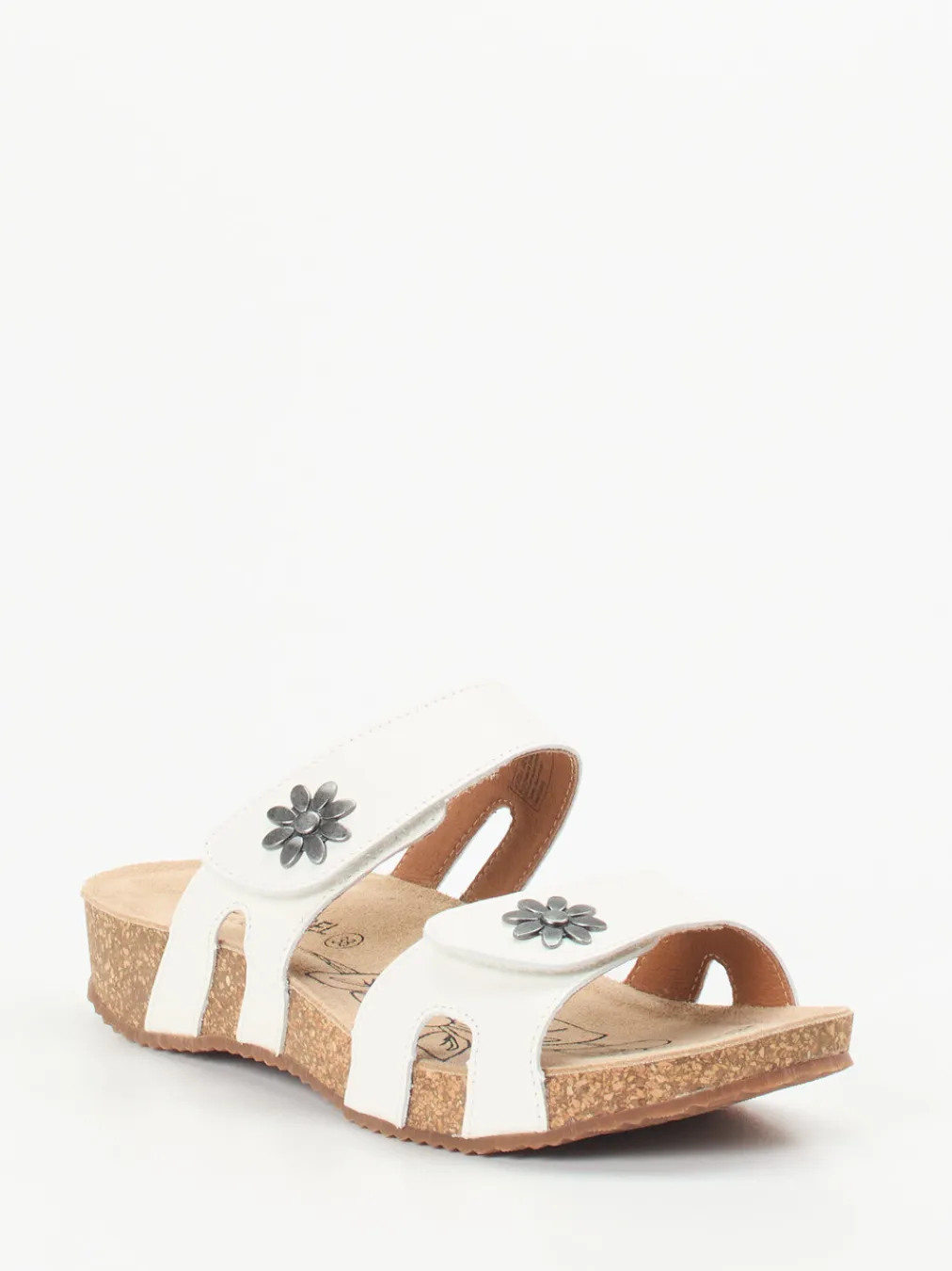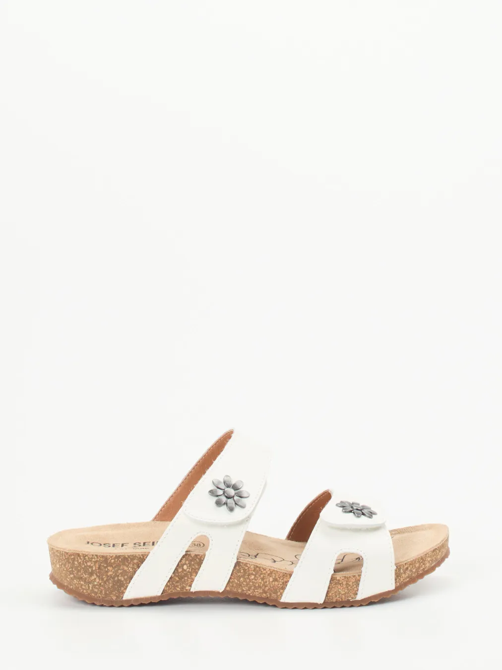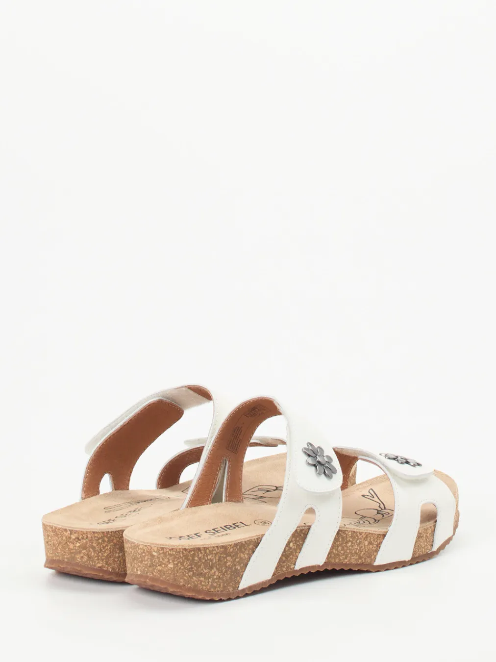 Sommerlicher Komfort mit liebevollem Detail.Josef Seibel präsentiert komfortable Damen-Sandalen in Pantolettenform. Für entspannte Urlaubstage oder den Wohlfühlmoment zu Hause bieten diese weißen Kalbleder-Pantoletten mit ihren zwei praktischen Klettverschlüssen eine optimale Passform. Das weiche Korkfußbett ist ergonomisch geformt und wird von einer profilierten Gummisohle ergänzt. Silberfarbene Metallblüten und das floral bedruckte Fußbett verleihen dem schlichten Design subtilen Charme. Die offene, ergonomisch angepasste Silhouette folgt klar dem Komfortprinzip und greift aktuelle Naturmaterial-Trends auf. Ideal kombinierbar mit Leinenhosen und luftigem Casualwear. Josef Seibel verbindet Funktionalität mit sommerlicher Leichtigkeit.