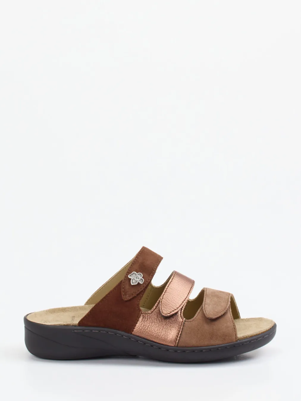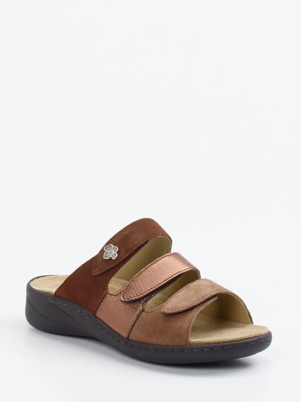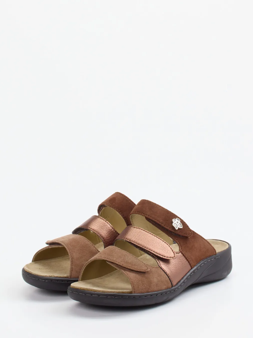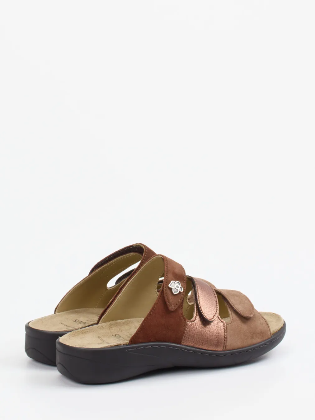 Strapazierfähig trifft stilvoll.Die Marke Solidus präsentiert mit diesen Komfort-Pantoletten ein Modell für anspruchsvolle Damen. Ob zu Hause oder beim Spaziergang: Die ergonomisch geformte Pantolette aus samtig angeschliffenem Veloursleder sorgt für weichen Auftritt. Eine kupferbraune Farbkomposition mit mittelbraunen Elementen verleiht dem Design Tiefe, während ein Metall-Emblem und glänzender Mittelriemen für dezente Eleganz sorgen. Verstellbare Klettverschlüsse und ein gepolstertes Fußbett garantieren optimale Passform. Die profilierte Gummisohle unterstützt sicheres Gehen – auch barfuß ein Genuss. Aktueller Trendfaktor: Metallic Accents für Frühjahr/Sommer. Solidus verbindet Komfort und Design zu alltagstauglicher Wellness für die Füße.