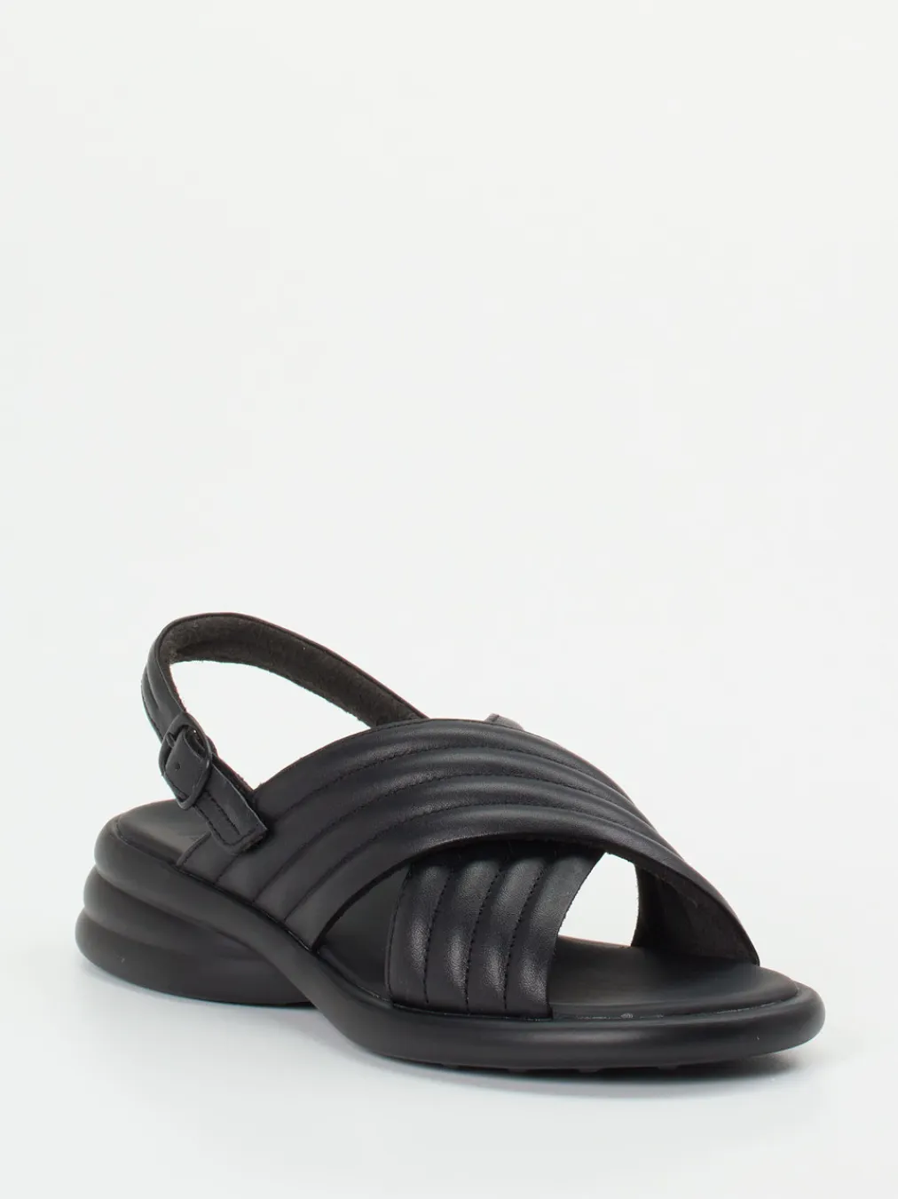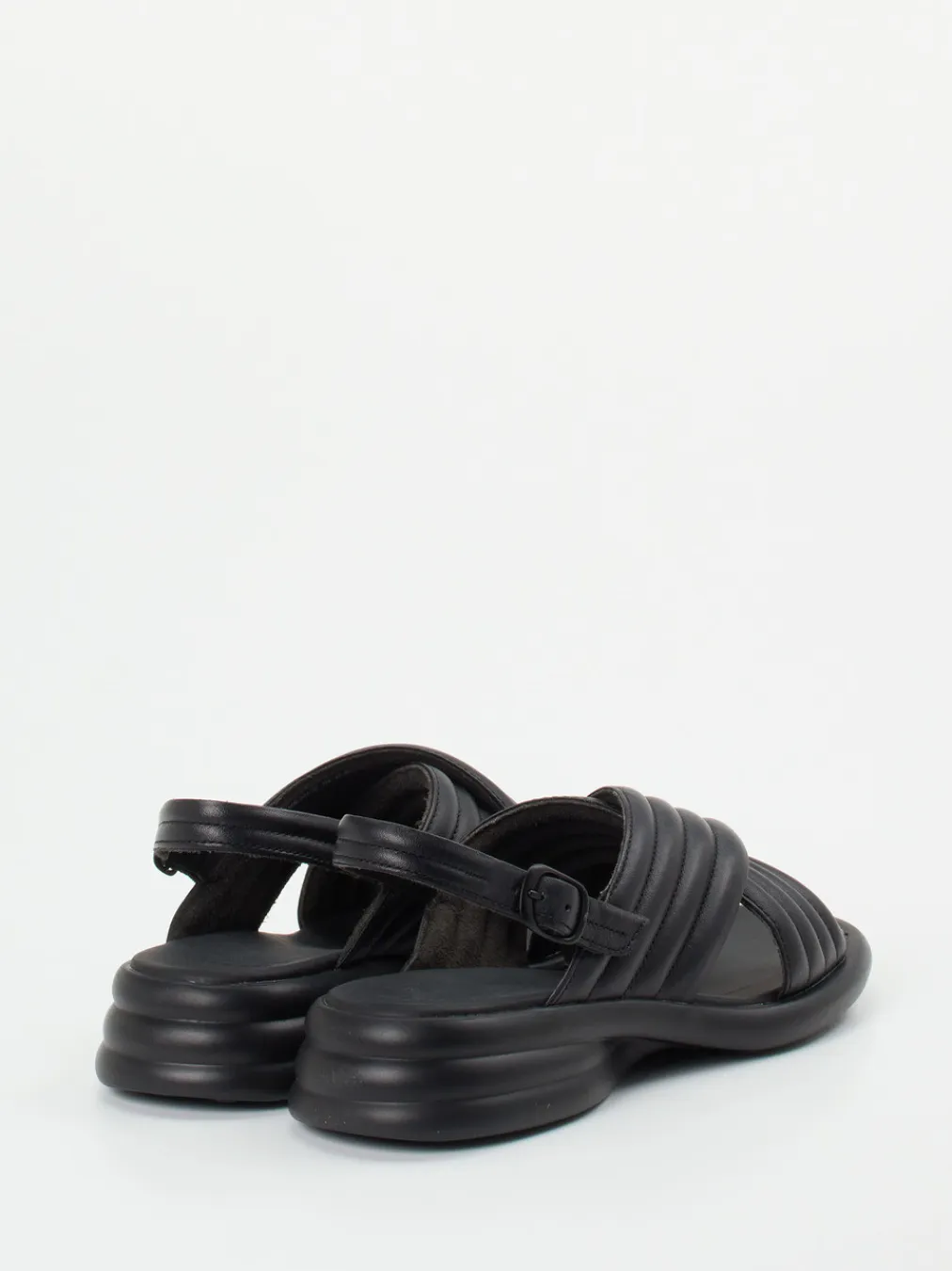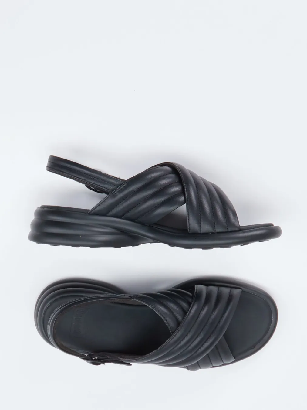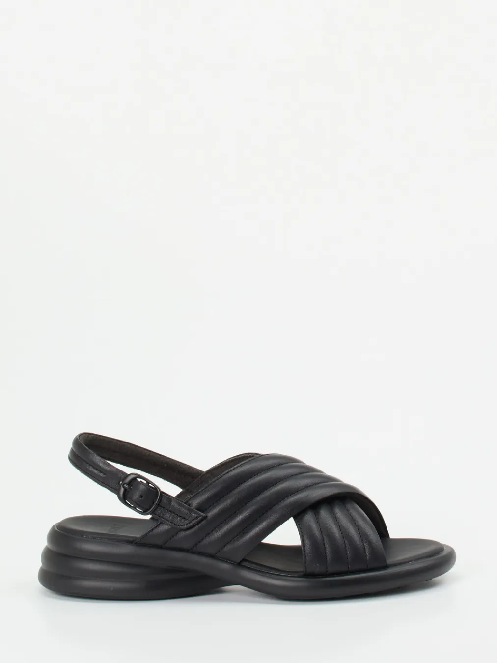 Minimalismus mit maximalem Komfort.Camper präsentiert eine Damen-Komfortsandale mit anatomischem Aufbau und stilvoller Zurückhaltung. Für warme Tage und lange Strecken entwickelt, überzeugt das Modell durch gepolsterte Kreuzriemen aus matt schwarzem Kalbleder, verstellbaren Fersenriemen mit Dornschließe und stabiler Gummisohle mit ovalem Rillenprofil. Die leicht gepolsterte Riemenstruktur, dezente Ton-in-Ton-Nähte und ein softes Mikrofaserfutter sorgen für ein angenehm entspanntes Tragegefühl. Die klar definierte Silhouette im Stil von „Quiet Luxury“ passt in minimalistische Sommer-Looks und harmoniert gut mit luftiger Casual-Wear. Ein stilvolles Modell, das Komfortbewusstsein und Designanspruch vereint.