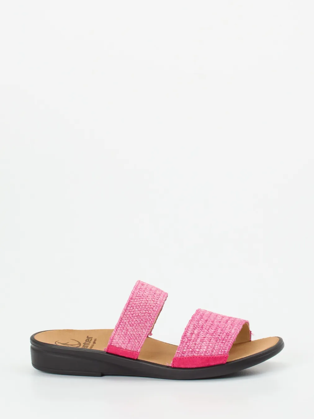 Sommerlicher Komfort in markanter Farbe.Ganter präsentiert mit dieser Komfort-Sandale ein stilvolles Modell für warme Tage. Ideal für Freizeit, Urlaub oder Zuhause: Das strukturierte pinkfarbene Basttextil mit Velourslederdetails sorgt für ein lebendiges Statement, das anatomisch geformte Lederfußbett unterstützt den Tragekomfort spürbar. Die schwarze PU-Sohle ist rutschhemmend profiliert und zeigt sich mit einem angedeuteten Keilabsatz von 1,6 cm. Zwei breite Riemen in Schlupfform unterstreichen das ergonomische Design. Inspiriert vom Trend „Bold Colors SS24“ ist dieses Modell perfekt für komfortaffine Casual-Looks. Authentischer Sommerkomfort – durchdacht umgesetzt von Ganter.