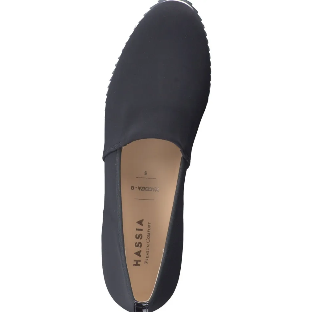 Gelungene Verbindung von Komfort und Design.Hassia präsentiert einen Damen-Komfort-Slipper, der modernes Understatement mit funktionellen Details vereint. Ob beim Stadtbummel oder zuhause – das elastische Textilobermaterial schmiegt sich angenehm an den Fuß und kombiniert matten Look mit einem glänzenden Lackdetail an der Ferse. Die tiefschwarze Grundfarbe wird durch rot-weiße Kontraststreifen an der zweifarbigen Keilsohle akzentuiert. Innen sorgt ein gepolstertes Lederfutter für angenehmes Tragegefühl, das Vario-Fußbett lässt sich durch eigene Einlagen ersetzen. Der sportlich-inspirierte Schlupfschuh zeigt sich trendsicher in Color-Blocking und Streetwear-Stil. Hassia-Komfort für anspruchsvolle Alltagsmomente mit minimalistischem Chic.