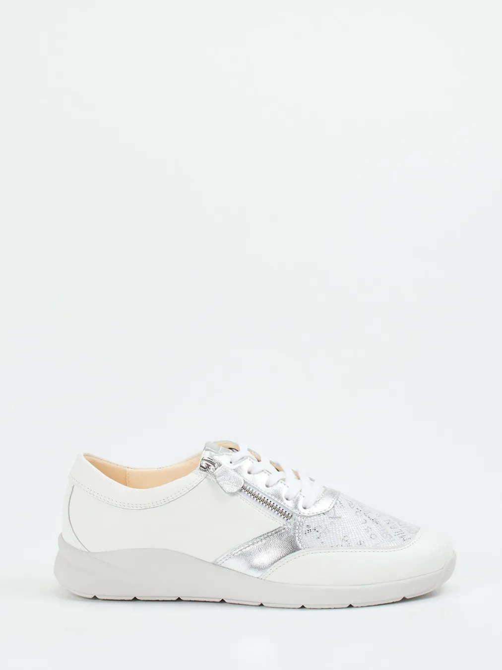 Komfort trifft auf glänzende Details.Der Damen-Komfortsneaker von Christian Dietz vereint entspanntes Design mit exklusiver Ausstrahlung. Perfekt für entspannte Tage in der Stadt oder unterwegs: Gefertigt aus weißem Kalbleder, ergänzt durch silberfarbenes Metallicleder und eine glänzende, genarbte Oberfläche. Auf dem Vorderblatt sorgt ein strukturiertes Textil mit Mesh-Optik und Wording-Print für einen modischen Akzent. Die klassische flache Silhouette wird durch Schnürung und einen seitlichen Reißverschluss ergänzt, während das perforierte Fußbett und der Shock-Absorber in der Sohle für angenehmes Laufgefühl sorgen. Stilistisch vereint der Schuh Elemente aus Streetwear und Quiet Luxury. Ein moderner Wohlfühl-Sneaker mit Anspruch an Qualität und Design.