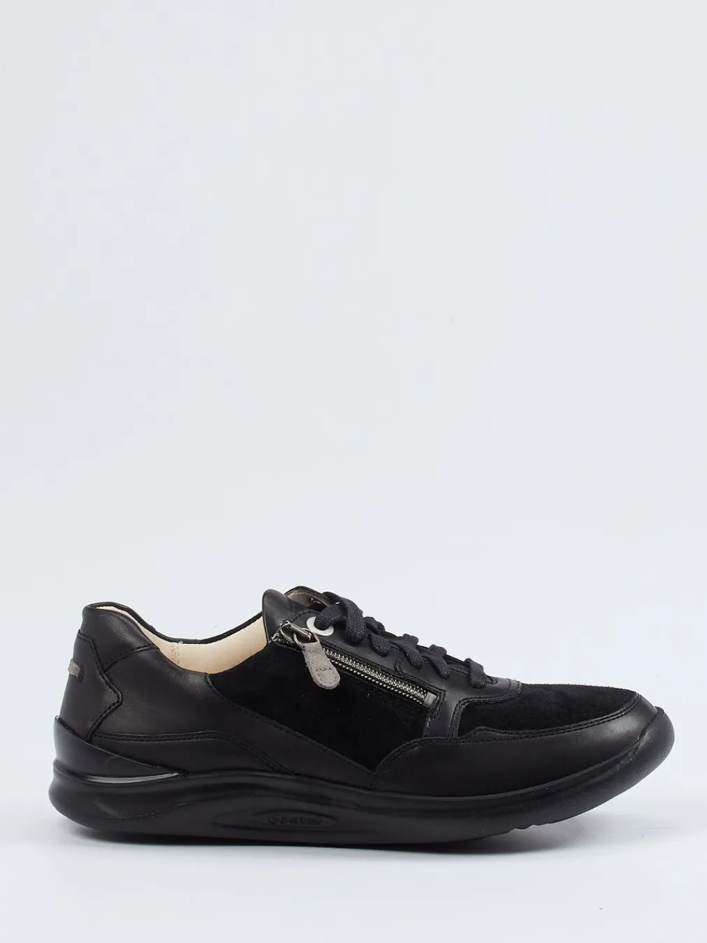 Komfort trifft auf Minimalismus.Ganter präsentiert mit diesem Damen-Komfort-Sneaker ein durchdachtes Modell mit Fokus auf Bequemlichkeit. Für entspannte Spaziergänge oder den täglichen Weg zur Arbeit bietet dieser Sneaker mit ergonomischer Laufsohle und weichem Schaftrand eine ideale Lösung. Verarbeitet wurde hochwertiges Kalbleder, kombiniert mit samtigem Veloursleder in klassischem Schwarz. Die abgerundete Form, der seitliche Reißverschluss und tonige Nähte betonen den funktional-minimalistischen Look. Ein herausnehmbares Korkfußbett und die weite H sorgen für individuellen Tragekomfort. Der Stil passt besonders gut zu casual-orientierten Outfits und monochromen City-Looks. Ganter überzeugt mit durchdachtem Komfort und dezenter Eleganz.