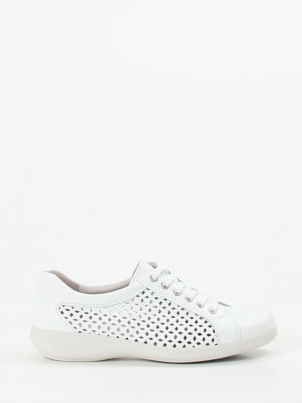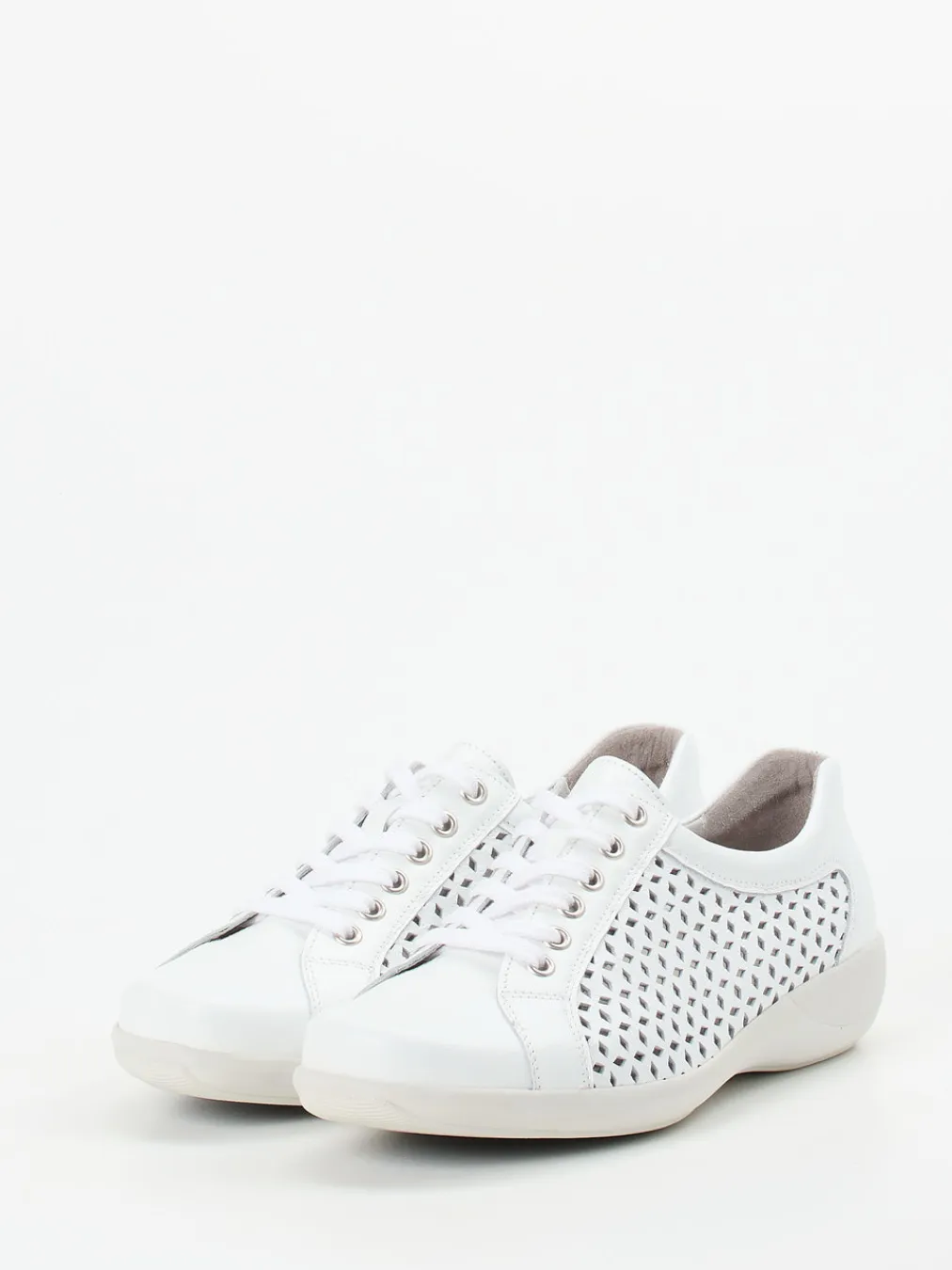 Bequemer Auftritt bei sommerlicher Leichtigkeit.Stuppy präsentiert mit diesem Komfort-Sneaker ein durchdachtes Damenmodell für Freizeit und Alltag. Weiße Kalbleder-Verarbeitung trifft auf funktionale Details wie die perforierten Seitenpartien für ein luftiges Tragegefühl und eine individuell anpassbare Schnürung. Die glänzende Oberfläche, das gepolsterte Futter und metallische Ösen unterstreichen den stilvollen Minimalismus. Die ergonomisch geformte Gummisohle bietet mit 2 cm Absatz rutschhemmende Stabilität – ideal für entspannte Spaziergänge. Besonders passend zu leichten Sommerhosen oder Poloshirts. Stuppy steht hier für kompromisslosen Komfort mit klarer Linienführung und saisonaler Ausstrahlung.