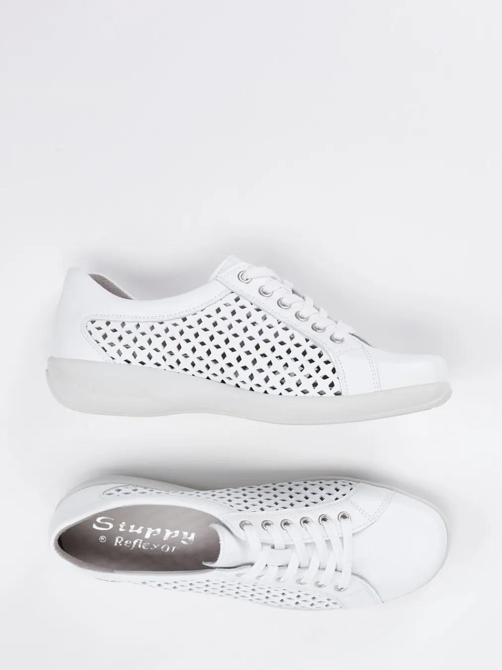 Der weiße Komfort-Sneaker von Stuppy überzeugt mit atmungsaktiver Lochstruktur und einem weichen, gepolsterten Innenleben – ideal für entspannte Sommertage.