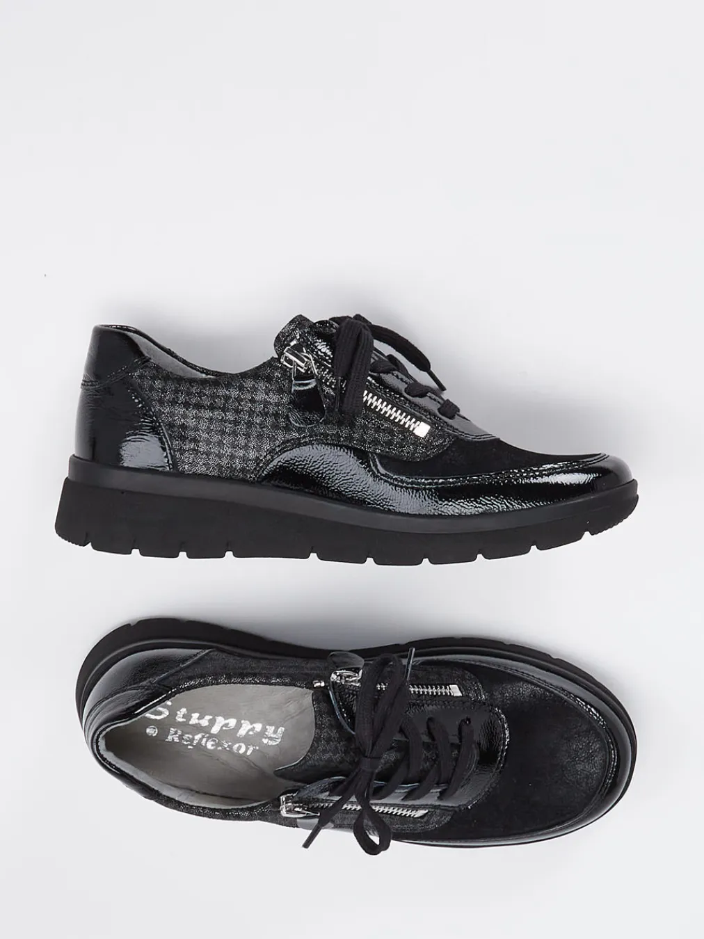 Glanz trifft Komfort im Alltag.Die Marke Stuppy bietet mit diesem Komfort-Sneaker ein durchdachtes Design für Damen. Ob für Büro oder Freizeit – das schwarze Lackleder mit glänzenden Partien und Hahnentrittmuster verleiht dem Modell einen eleganten Streetwear-Akzent. Gepaart mit flexiblem Stretchmaterial und weichem Innenfutter aus Leder und Textil entsteht hoher Tragekomfort. Die silberfarbenen Reißverschlüsse neben der Schnürung erleichtern das An- und Ausziehen. Eine profilierte Gummisohle mit leichtem Keilabsatz bietet Grip und Alltagstauglichkeit. Der Materialmix mit Karomuster liegt im Trend. Stuppy steht für kompromisslose Bequemlichkeit mit stilvollem Anspruch.