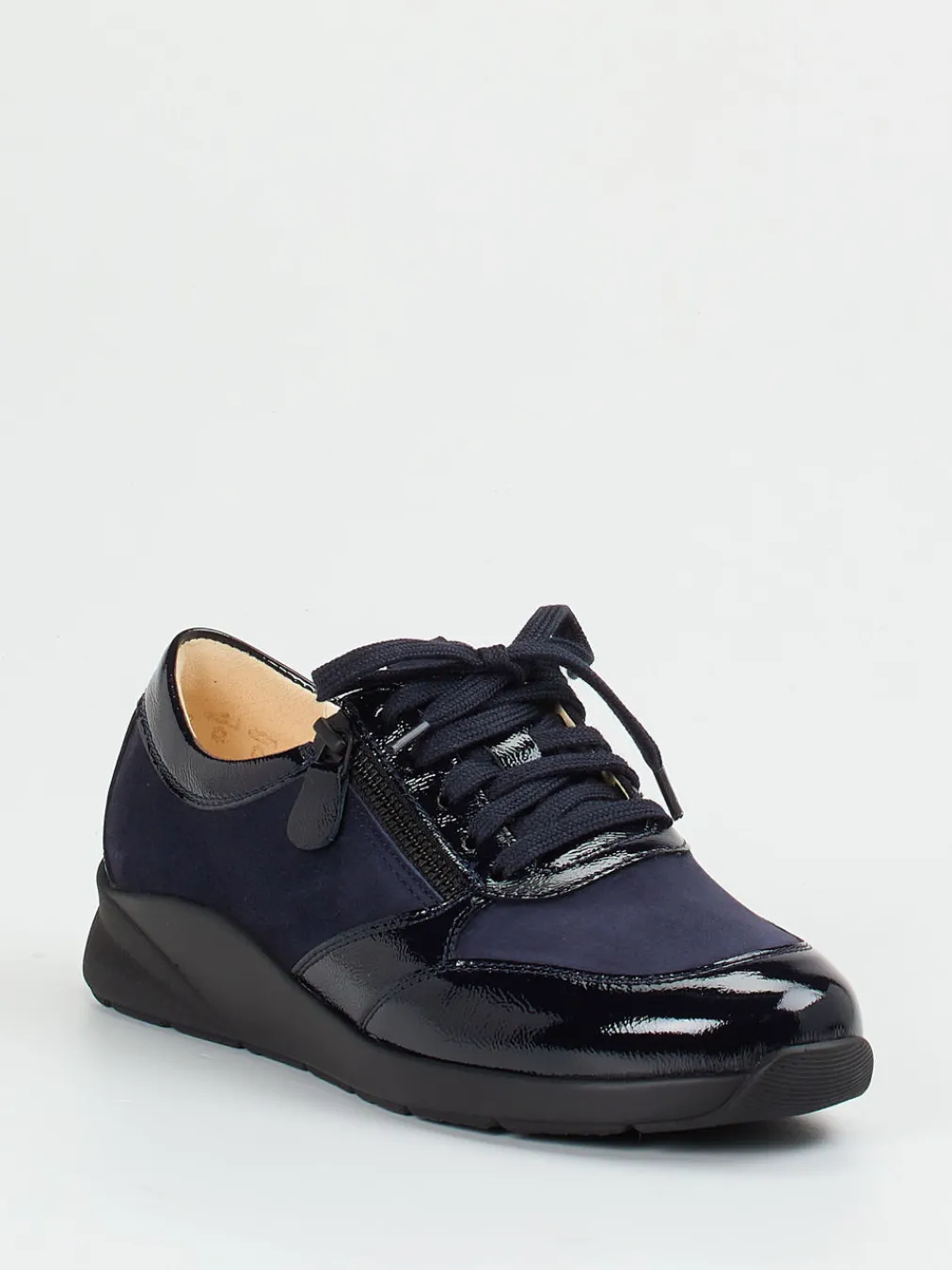 Der Materialmix aus samtigem Veloursleder und glänzendem Lackleder bringt raffinierten Stil in den Alltag. Die flexible Gummisohle mit Dämpfung sorgt für angenehmen Laufkomfort.
