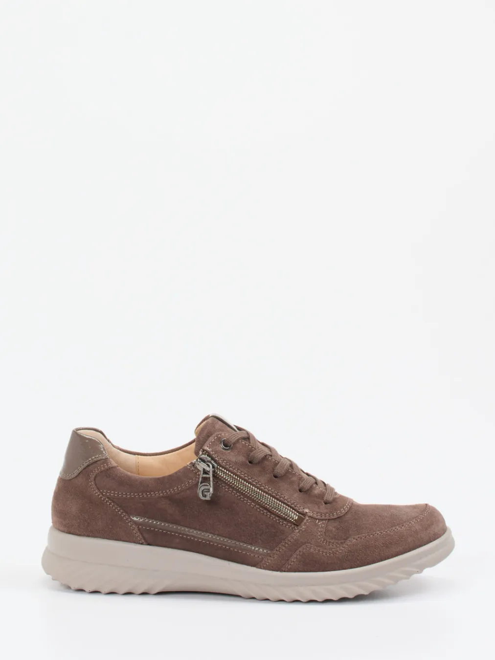 Dezente Begleiterin für bequeme Stunden.Ganter präsentiert mit diesem Komfort-Sneaker ein Modell für Damen, das lässigen Stil mit durchdachtem Komfort verbindet. Ob beim Stadtbummel oder in der Freizeit zu Hause – das Modell aus hochwertigem Veloursleder, samtig matt angeschliffen, überzeugt mit seiner mittelbraunen Farbgebung und dezenten Lackdetails an Ferse und Lasche. Die klassische, gerundete Silhouette wird durch Schnürung und seitlichen Reißverschluss ergänzt, wodurch ein müheloses An- und Ausziehen möglich ist. Die stoßdämpfende Laufsohle und die Eignung für Einlagen machen ihn besonders tragefreundlich. Stilistisch passt er perfekt zu minimalistischen Looks in sanften Neutralfarben. Markentypischer Komfort für stilbewusste Alltagssituationen.