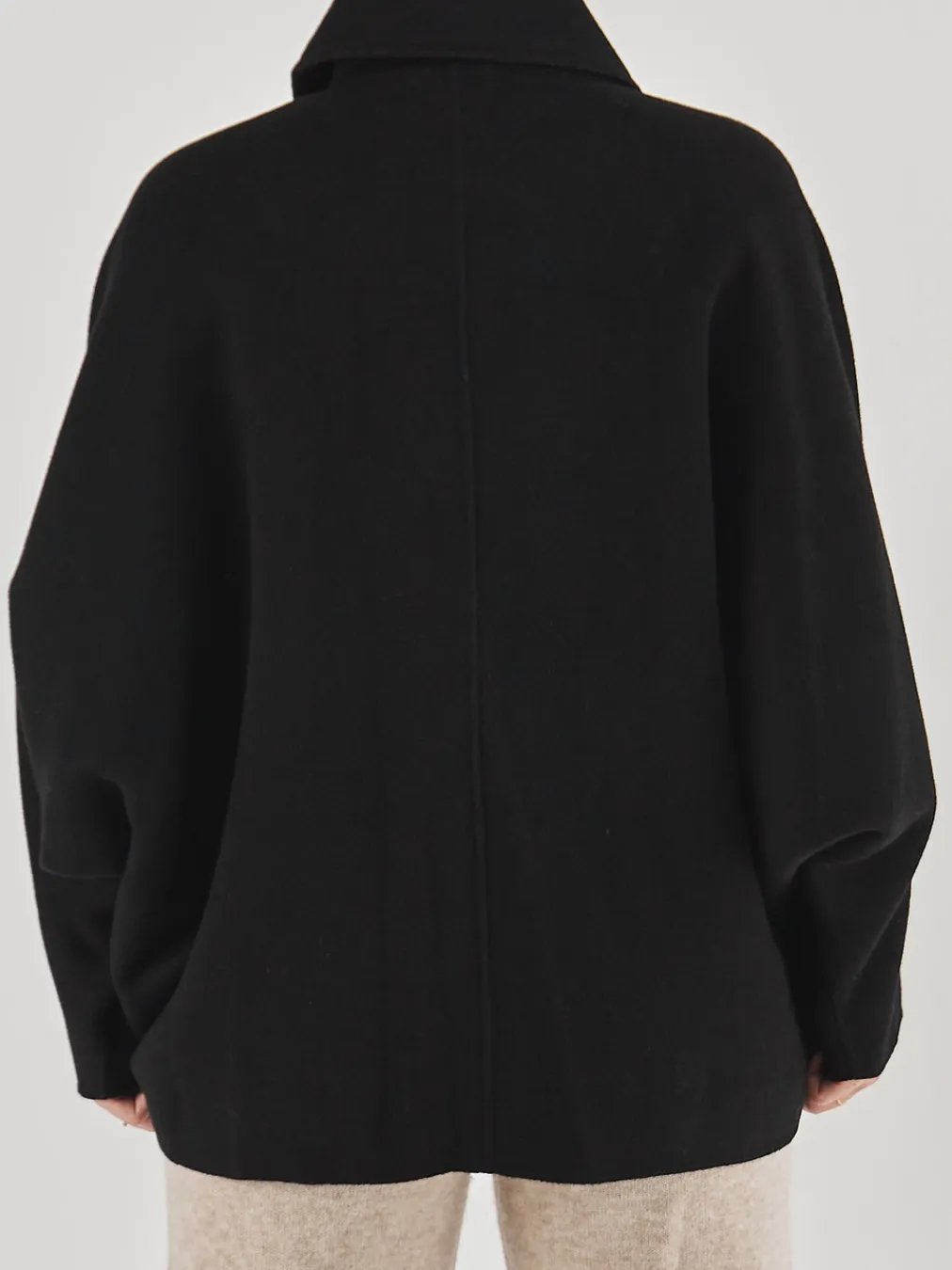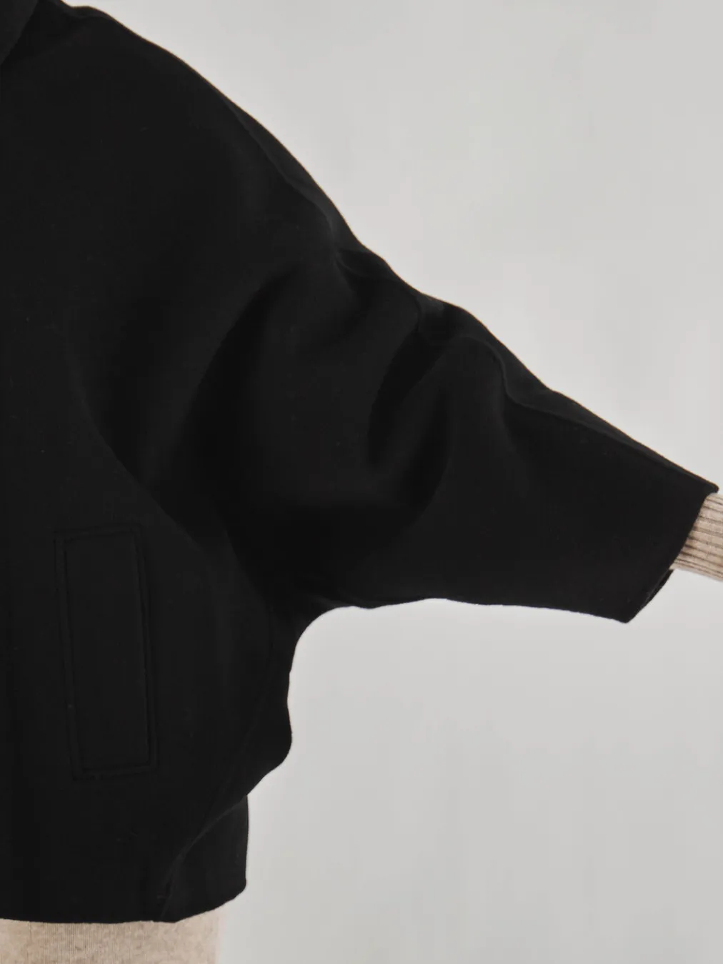 Die strukturierte Wollmischung mit Kaschmiranteil vereint angenehmen Tragekomfort mit minimalistischer Linienführung – perfekt für moderne Übergangslooks.