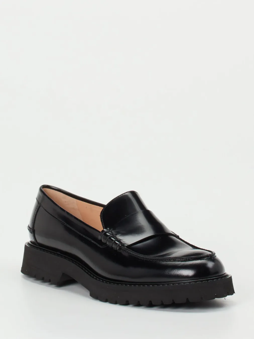 Puristisches Design trifft auf edle Verarbeitung: Dieser schwarze Loafer von Unützer kombiniert glänzendes Kalbleder mit markanter Profilsohle für stilvolle Auftritte.