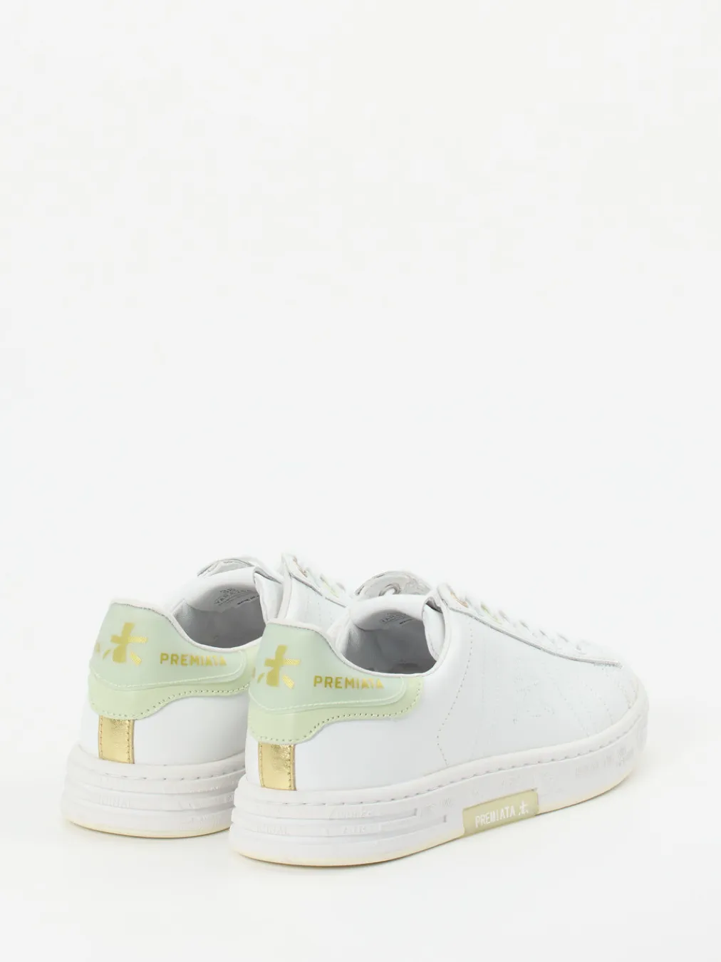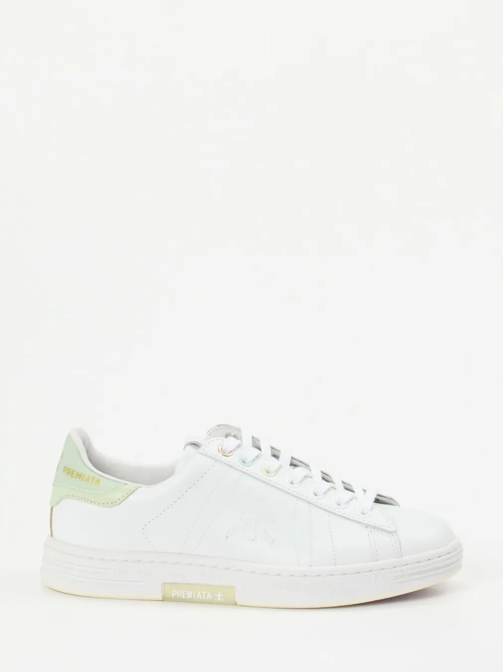 Minimalismus trifft Sommerfrische.Premiata präsentiert einen modernen Sneaker für entspannte Styles in der warmen Jahreszeit. Ein zuverlässiger Begleiter bei Städtereisen oder im Alltag überzeugt dieses Modell durch feines Kalbleder mit glattem Finish. Das klare Weiß wird durch pastellgrüne und goldfarbene Akzente an Ferse und Ösen detailreich ergänzt. Die klassisch-runde Silhouette mit Schnürverschluss und weißer Gummisohle unterstreicht den cleanen Charakter. Das wechselbare Fußbett sorgt für Komfort, während das Design durch dezente Logo-Prägungen abgerundet wird. Attraktiv im Trend: der Pastellfarben-Look Sommer 2024. Ein Premium-Sneaker mit Sinn für urbane Lässigkeit und zurückhaltende Raffinesse.