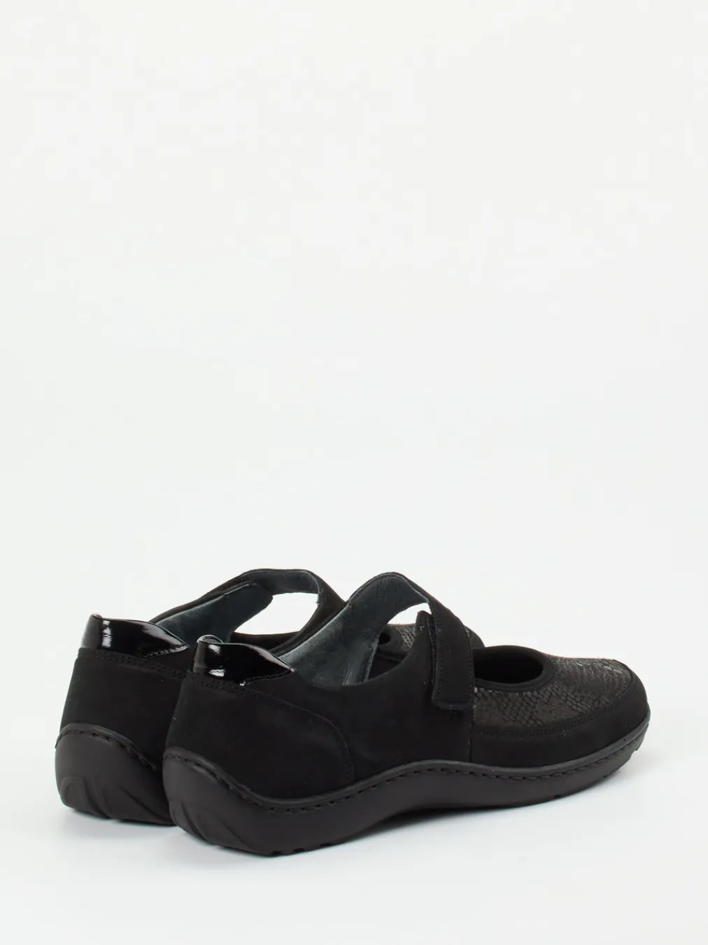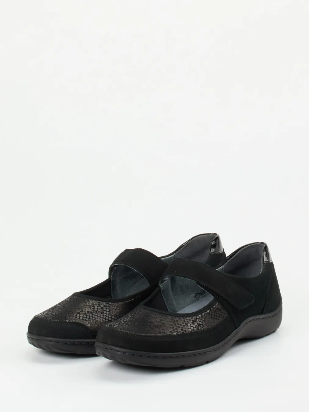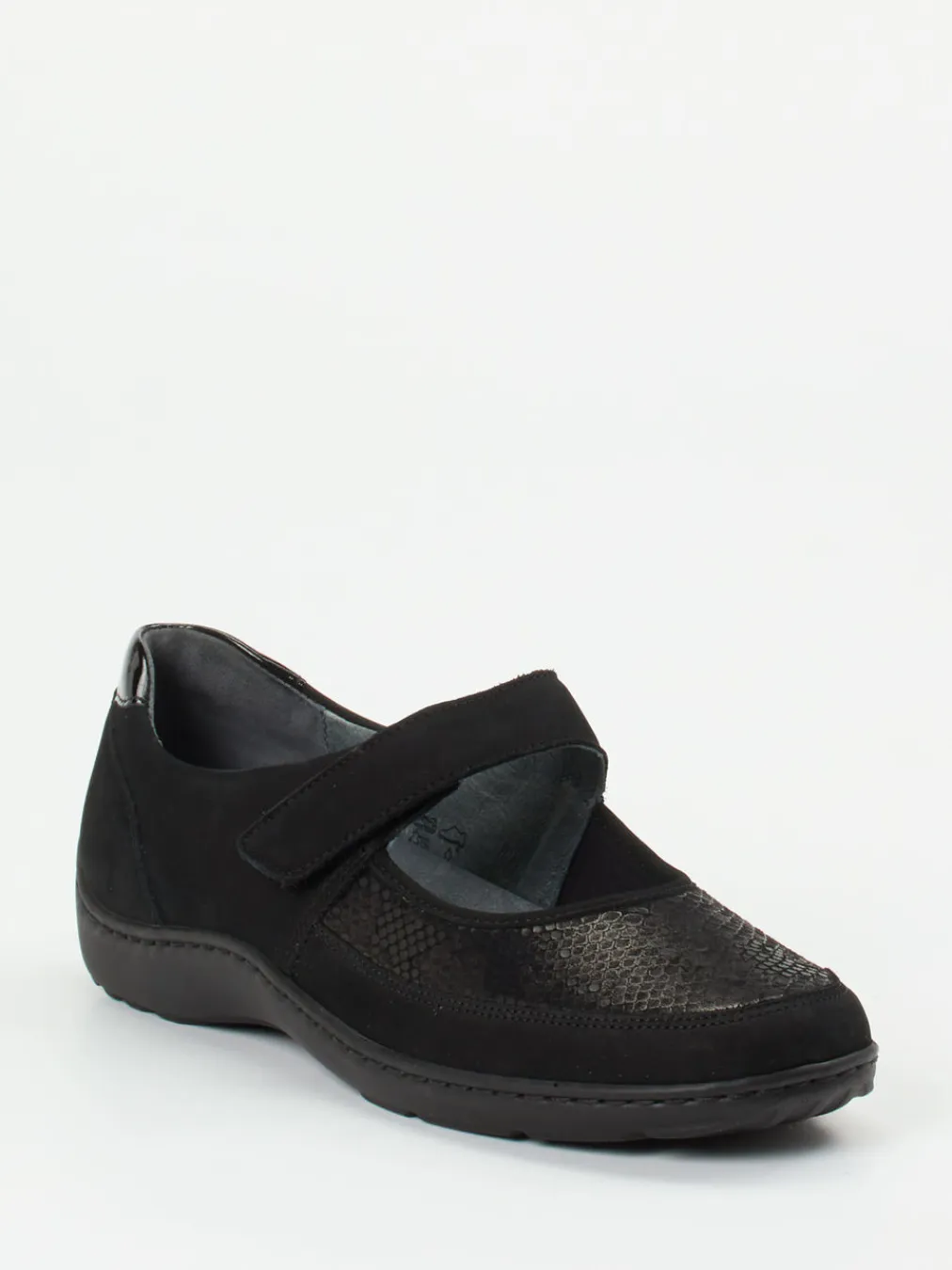 Komfort mit Stil im Alltag.Waldläufer präsentiert mit diesem Mary-Jane-Halbschuh eine elegante Komfortlösung für entspannte Tage. Bei langen Laufwegen in der Stadt oder zu Hause überzeugt das Modell durch ein anschmiegsames Stretchmaterial in Reptil-Optik, kombiniert mit samtig angeschliffenem Veloursleder in Schwarz. Die ergonomische Form wird durch einen praktischen Klettverschluss ergänzt. Eine verstärkte Fersenkappe mit glänzendem Lackelement betont das Design subtil. Die erhöhte PU-Profilsohle wirkt gelenkschonend und sorgt für Trittsicherheit. Inspiriert vom „Quiet Comfort“-Trend ist das Modell ideal für komfortaffine Looks mit Strick und Jersey. Bequemlichkeit auf höchstem Niveau – made by Waldläufer.