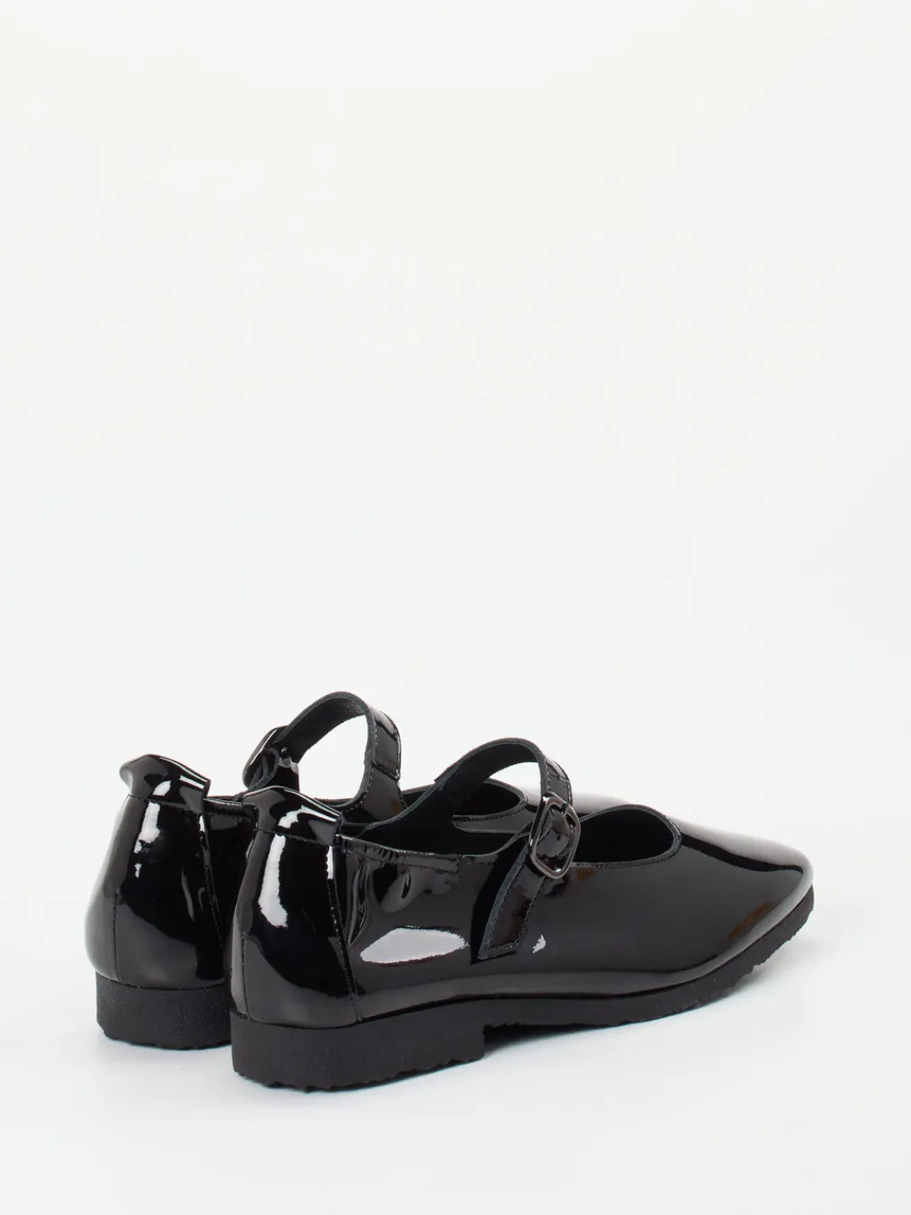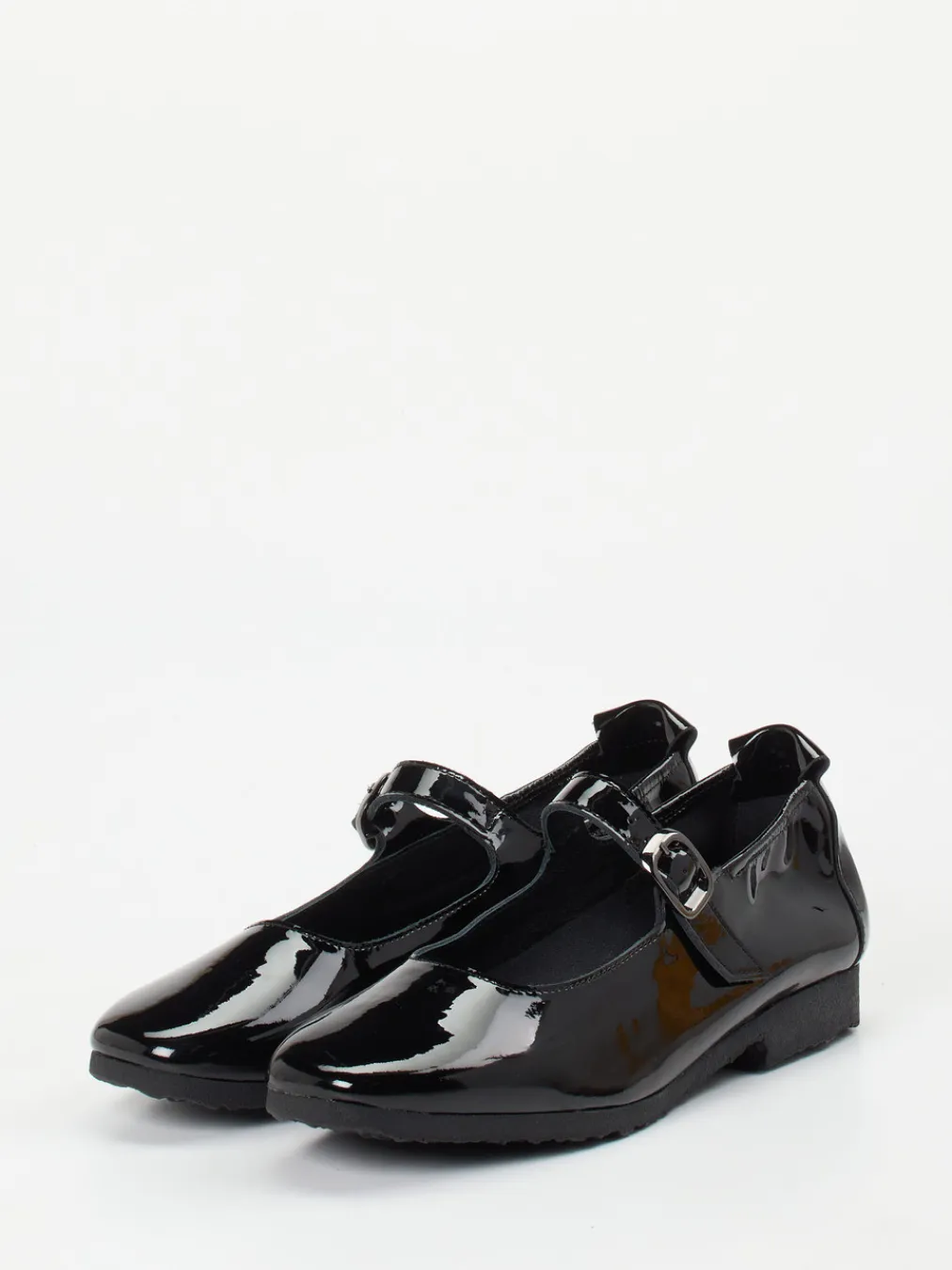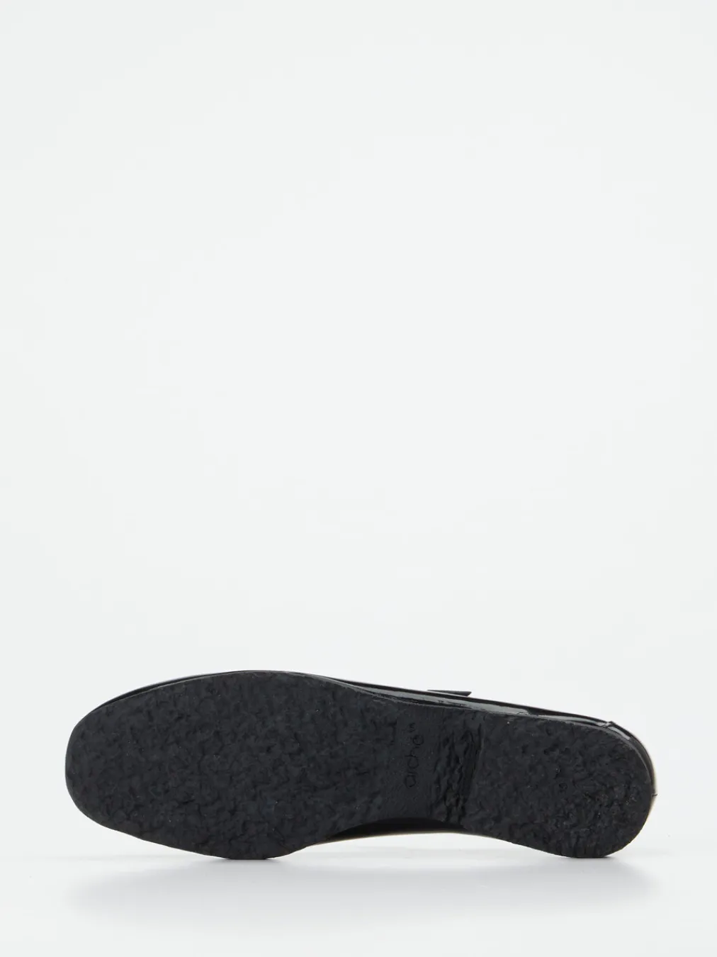 Ideal für Office-Tage oder City-Ausflüge: Diese schwarzen Ballerinas verbinden hochwertiges Lackleder mit glänzender Oberfläche und flacher, flexibler Gummisohle. Der verstellbare Riemen mit feiner Metallschnalle sorgt für sicheren Halt und stilvolle Akzente. Die klare Silhouette und Ton-in-Ton-Nähte betonen ihren minimalistischen Charakter, passend zu Quiet-Luxury- und Balletcore-Trends. Besonders harmonisch wirken sie in Kombination mit blickdichter Strumpfhose und schlichter Lederhandtasche.