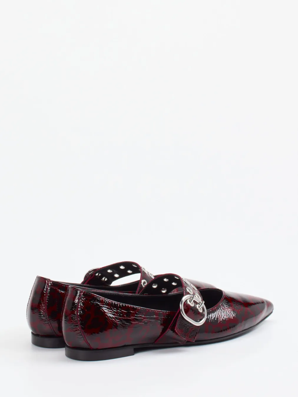 Trendige Mary Janes mit spitzem Leisten und glänzendem Lackleder in dunkelroter Animal-Optik. Silberfarbene Ösen und ein markanter Riemen setzen stilvolle Statements.