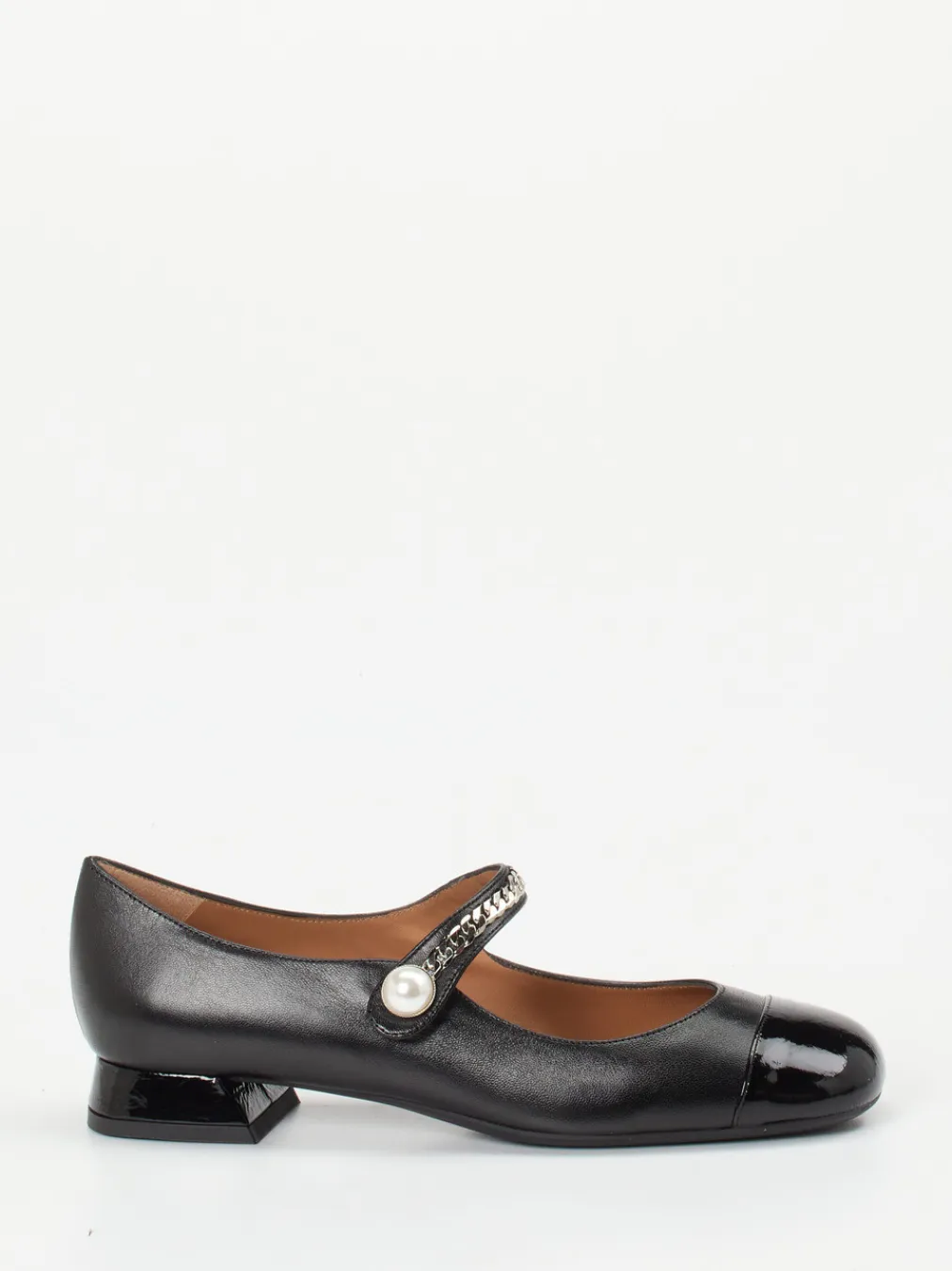 Für stilvolle Office-Days oder elegante Freizeitmomente bieten diese schwarzen Ballerinas aus weichem Lammleder mit hochglänzender Lackkappe einen stilsicheren Auftritt. Der elastisch gearbeitete Spangenriemen wird durch eine silberne Gliederkette und eine große Zierperle effektvoll betont – eine subtile Hommage an den Pariser Chic. Mit lederbezogenem Absatz, gepolsterter Innensohle und flexibler Gummisohle tragen sie sich komfortabel und souverän. Stilistisch passen sie zur schmalen Hose oder zum Kleid mit Feinstrumpf.