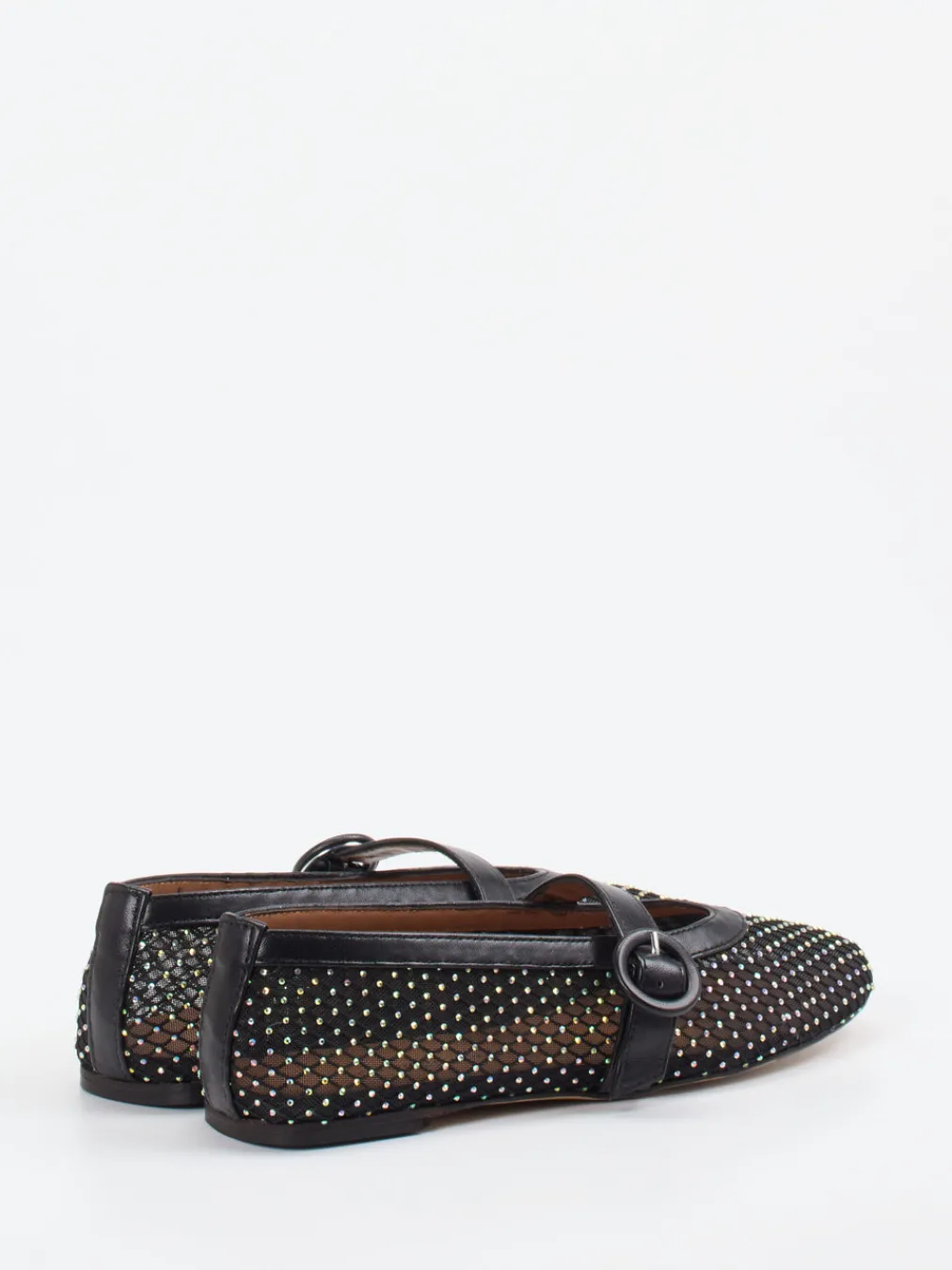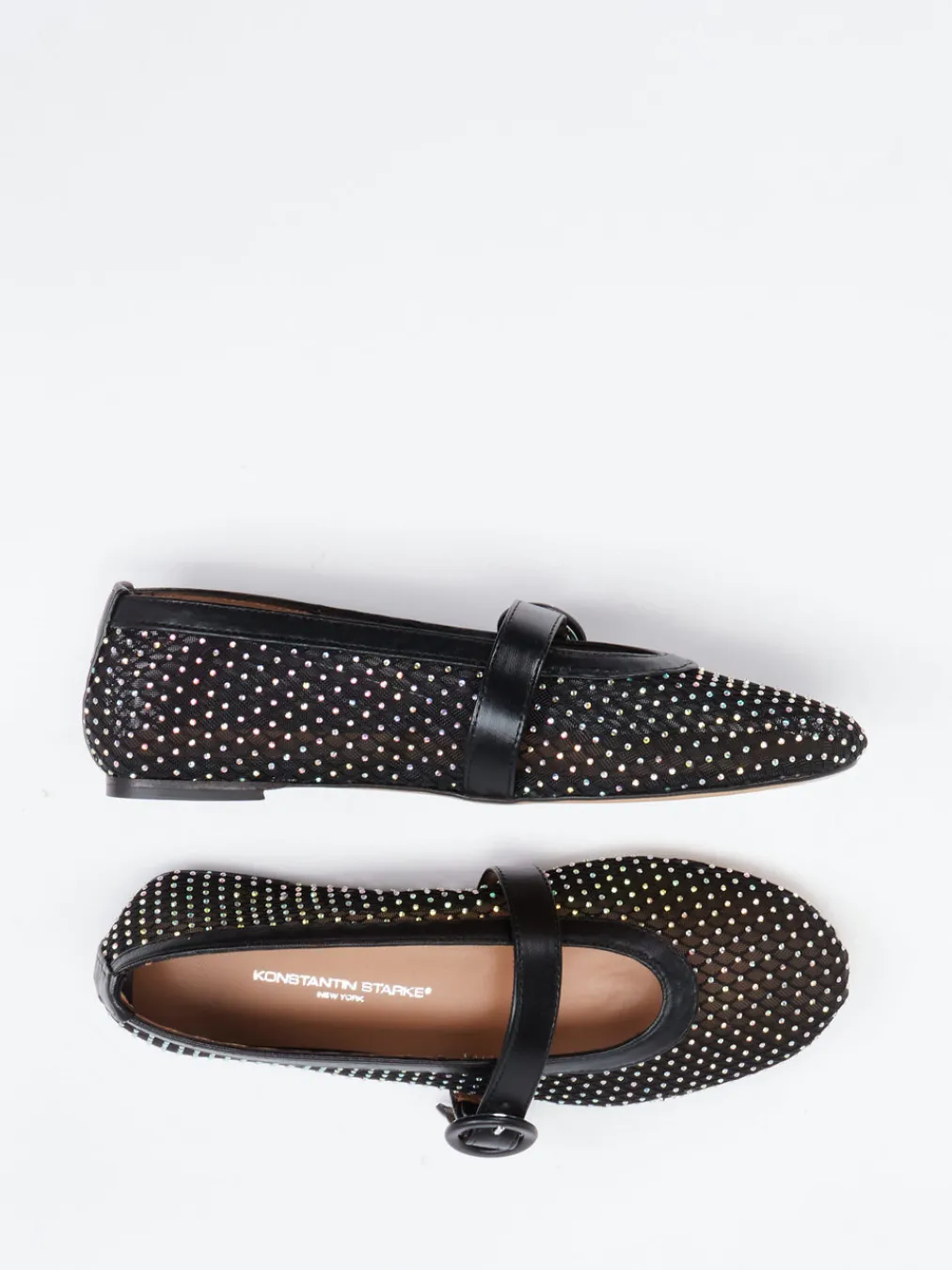 Party-Essential mit glitzernder Note.Diese Mary Jane Ballerinas von Konstantin Starke vereinen transparentes Netzmaterial mit markantem Vintage-Flair. Ob für den Abendanlass oder als modisches Statement im Alltag – das halbtransparente Mesh mit irisierenden Strasssteinen schafft einen auffallenden Look, der durch den schwarzen Lederriemen stilvoll akzentuiert wird. Die flache Silhouette mit verstellbarer Schnalle sorgt für eleganten Komfort, kombiniert mit einer hochwertigen Ledersohle. Schwarz als Hauptfarbe unterstreicht die minimalistisch-trendige Wirkung. Perfekt zu Slip-Dresses oder cropped Hosen – ein ikonischer Schuh für stilbewusste Auftritte voller Individualität.
