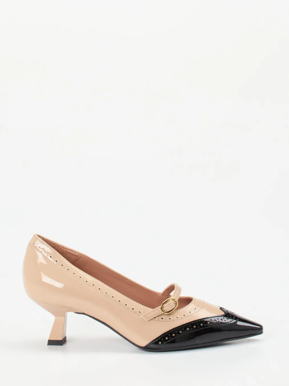 Retro-Akzent trifft Moderne.Die Marke Konstantin Starke präsentiert elegante Mary Jane Pumps für Damen. Ideal für formelle Events wie fürs Bürobesprechungen: Diese Pumps aus glänzendem Lackleder in Nude und Schwarz vereinen klassischen Chic mit liebevollen Details. Die spitz zulaufende Form, der grazile Kitten Heel und das feine Riemchen mit goldfarbener Schnalle erinnern stilvoll an den Vintage-Look der 50er. Die Lyralochung entlang der schwarzen Flügelkappe setzt einen edlen Akzent. Dank Kalblederfutter und gepolstertem Fußbett bleiben Komfort und Stil harmonisch verbunden. Ein Modell, das Retro-Chic mit moderner Zurückhaltung verbindet.