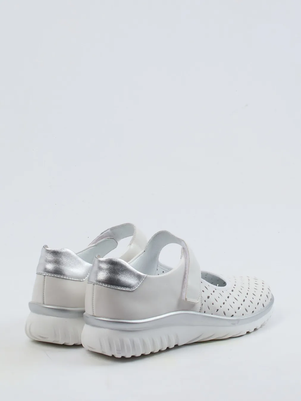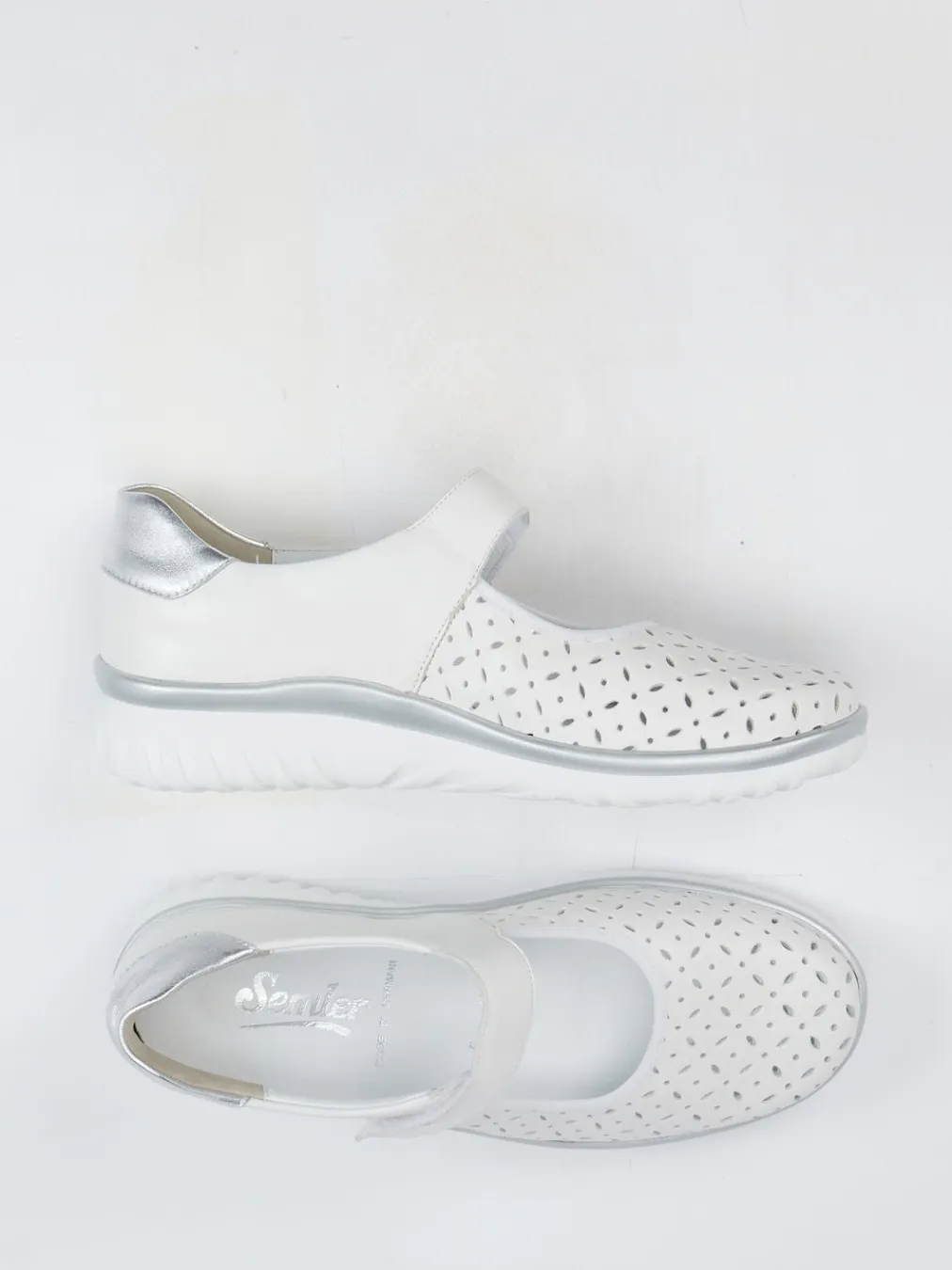 Komfort trifft luftige Frische.Semler präsentiert mit diesem Spangenschuh für Damen einen idealen Begleiter für entspannte Stunden. An warmen Tagen sorgt das weiße Kalbleder, ergänzt durch eine feine Perforation, für angenehme Luftzirkulation. Die runde, ergonomische Silhouette in Kombination mit dem gepolsterten Fußbett und der stoßdämpfenden PU-Sohle bietet zuverlässigen Laufkomfort. Ein silberfarbener Metallic-Einsatz an der Ferse verleiht dem Modell eine dezente Raffinesse. Der praktische Klettverschluss-Riemen erleichtert das An- und Ausziehen. Inspiriert durch Minimalismus und entspannte Trends lässt sich der Schuh vielseitig zu Casual-Looks kombinieren – ideal zu hellen Leinenhosen oder leichten Sommerblusen. Ein bequemer Begleiter mit durchdachtem Komfort für stilvolle Alltagsmomente.