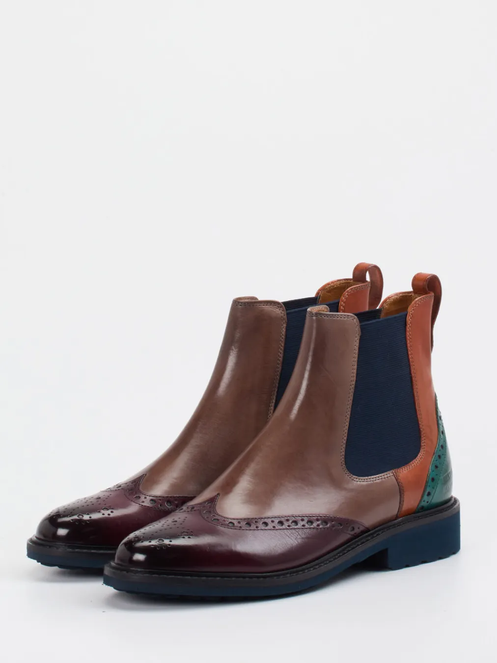 Stilsicher im Großstadtalltag.Melvin & Hamilton zeigt mit dieser Herren-Stiefelette ein stilprägendes Modell der Kategorie Chelsea Boots. Ob Büro oder Freizeit – der knöchelhohe Schnitt aus mehrfarbig glänzendem Kalbleder setzt ein modisches Statement. Die Brogue-Perforation verleiht dem Schuh eine klassische Note, während die Farbflächen in Mittelbraun, Bordeaux, Tannengrün und Dunkelblau für einen markanten Colorblock-Look sorgen. Seitliche Elastikeinsätze und eine Zuglasche hinten ermöglichen bequemes Anziehen. Die griffige Gummisohle und eine Absatzhöhe von 3 cm bieten zugleich Stabilität und Komfort. Ideal zu dunklen Chinos und farblich abgestimmtem Ledergürtel. Modernes Design mit unverwechselbarer Markenhandschrift.