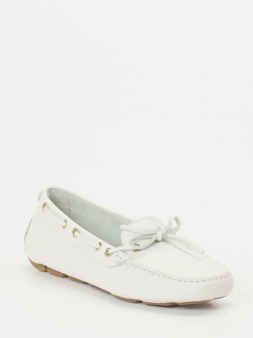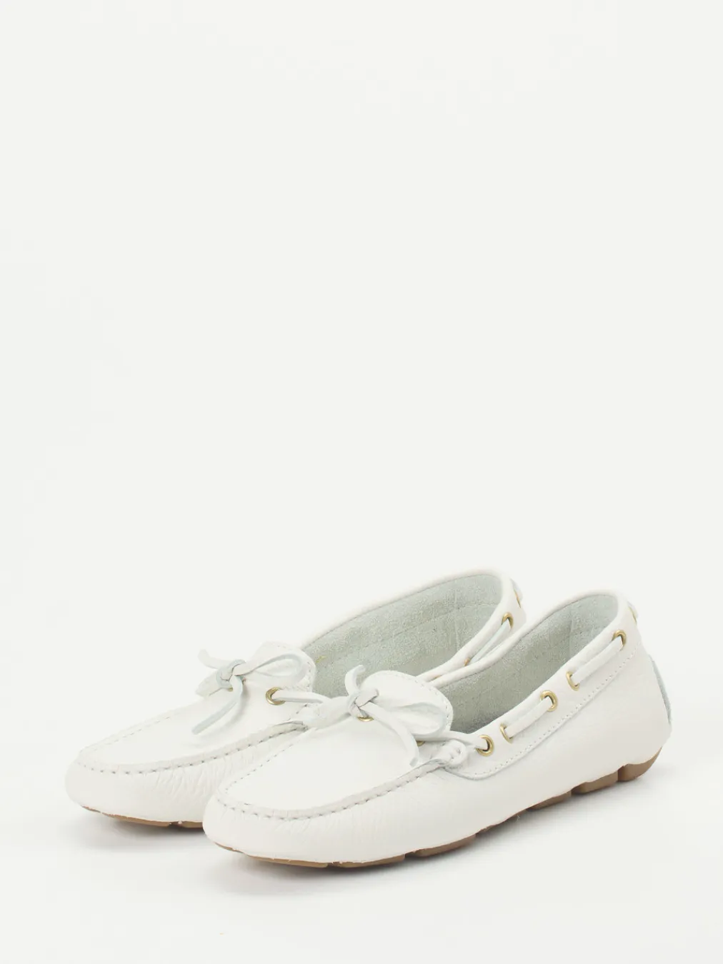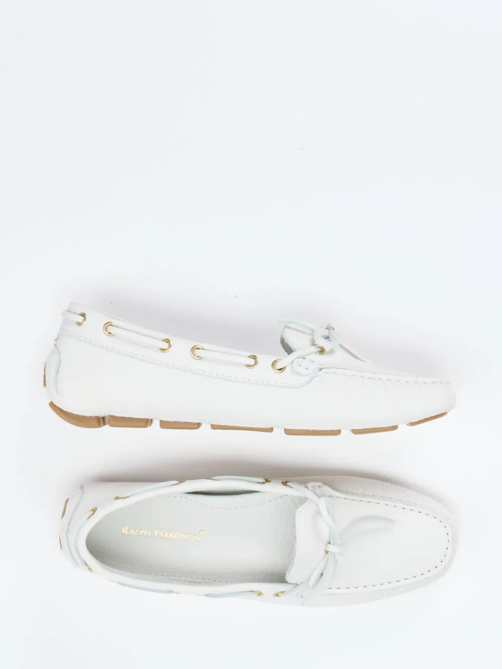 Flexibel, weich und leicht sind die Attribute dieses Mokassins der Marke Ralph Harrison. Das ungefütterte, sportlich genarbte Kalbleder hat eine frische weiße Farbe. Typisch für den Stil der Bootsschuhe ist der umlaufende Senkel. Die großen, messingfarbenen Ösen schmücken und geben Glanz. Die Sohle ist an der Ferse hoch gezogen, sie besteht aus honigfarbenen Gummikassetten. Mit diesem Mokassin finden Sie ein unkompliziertes Accessoire für sommerliche Tage.