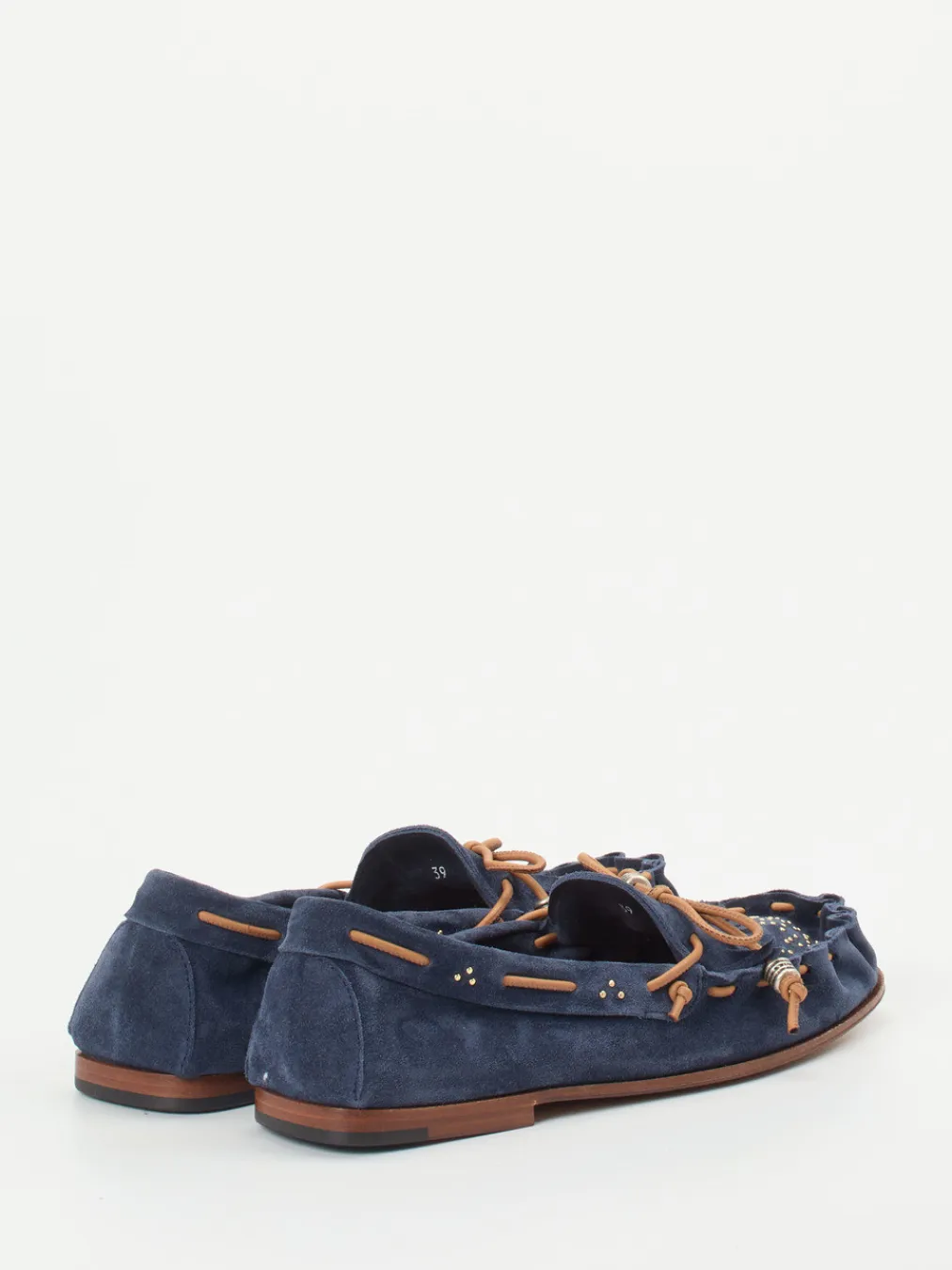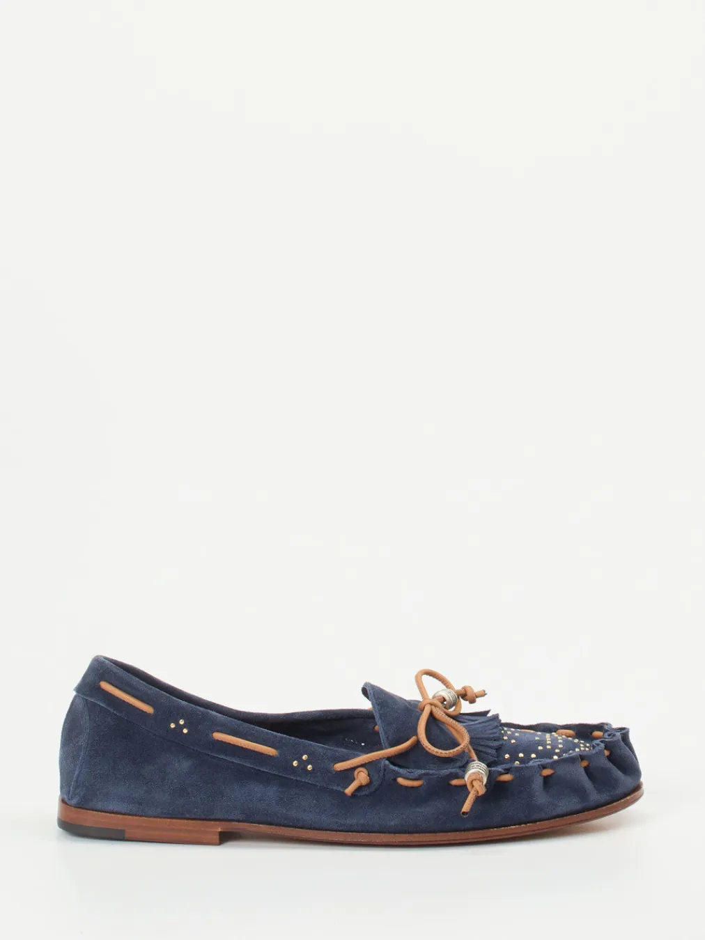 Handwerk und Stil im Boho-Flair.Henderson präsentiert mit diesen Mokassins ein hochwertiges Damenmodell aus dunkelblauem Veloursleder. Ideal für Urlaub oder entspannte Tage in der Stadt sorgt das samtig matte Leder für ein angenehmes Tragegefühl. Zarte cognacfarbene Lederbänder, silberfarbene Perlen und goldene Nietendetails unterstreichen die Boho-Chic-Ästhetik. Die flache Silhouette mit rahmengenähter Ledersohle spricht für italienische Handwerkskunst und raffiniertes Designbewusstsein. Die Schlupfform erleichtert das Anziehen, das ungefütterte Innenleben verleiht sommerliche Leichtigkeit. Kombiniert mit einer Leinenhose oder einem Maxikleid entsteht ein stimmiger Look. Der Slipper überzeugt mit liebevollen Details und stilvoller Lässigkeit – ein echtes Signature-Stück von Henderson.